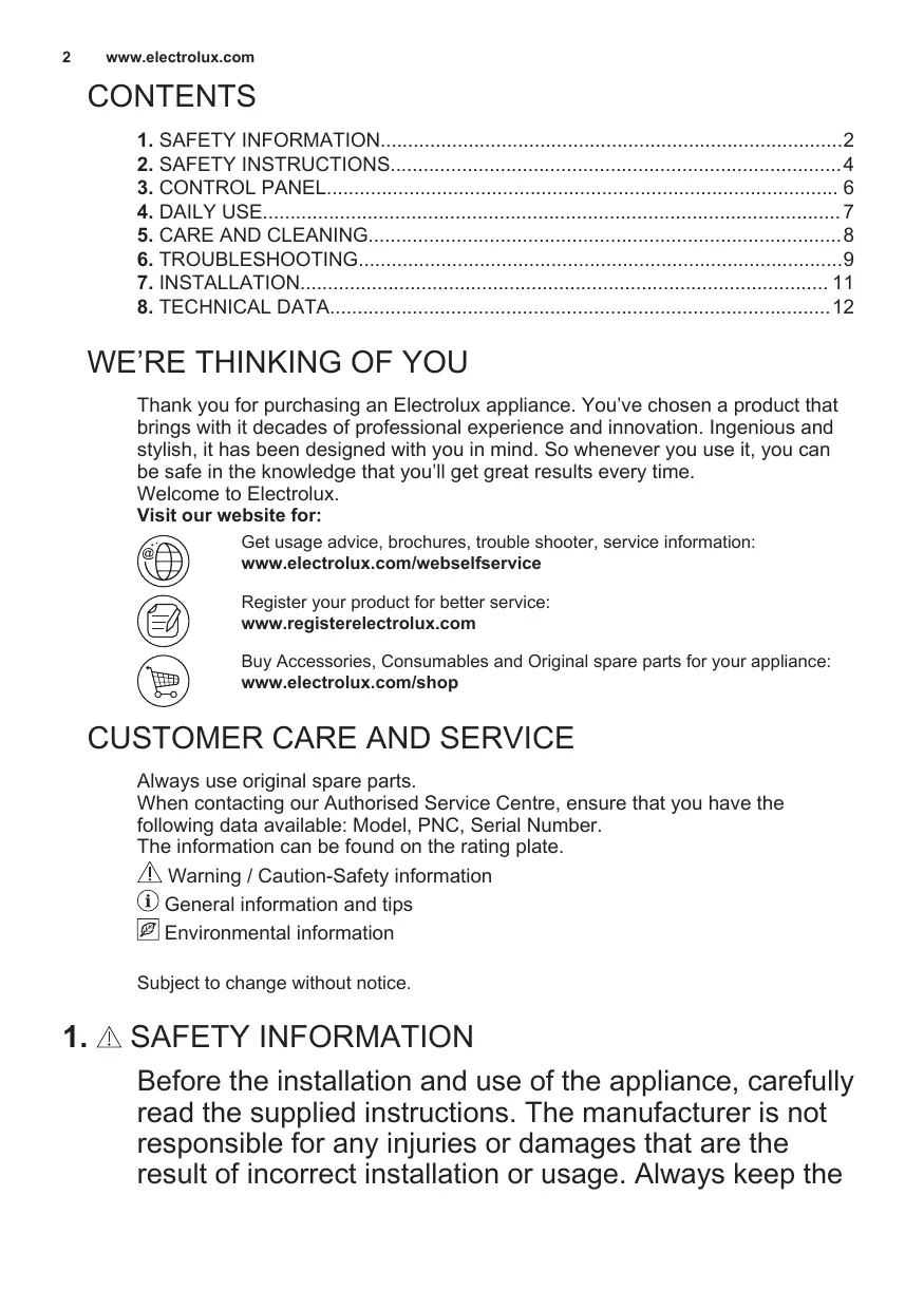 WE’RE THINKING OF YOU Thank you for purchasing an Electrolux appliance. You’ve chosen a product that brings with it decades of professional experience and innovation. Ingenious and stylish, it has been designed with you in mind. So whenever you use it, you can be safe in the knowledge that you’ll get great results every time. Welcome to Electrolux. Visit our website for: