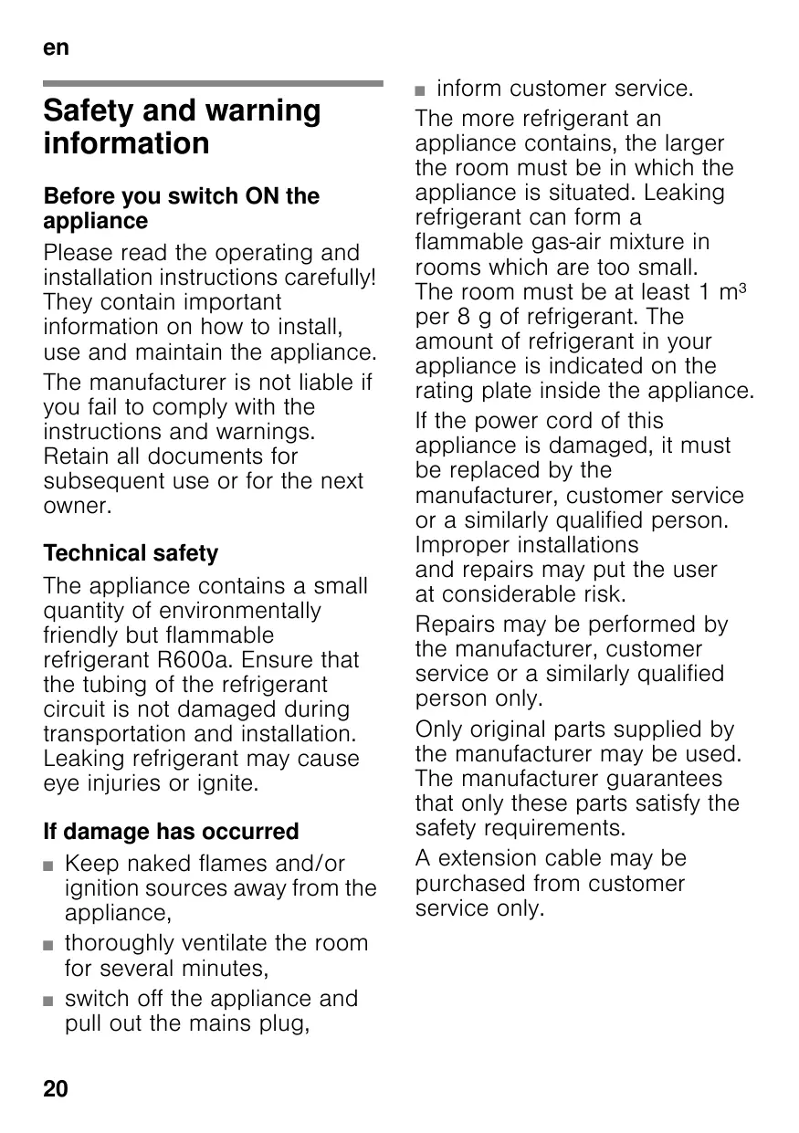 Safety and warning information Before you switch ON the appliance Please read the operating and installation instructions carefully! They contain important information on how to install, use and maintain the appliance. The manufacturer is not liable if you fail to comply with the instructions and warnings. Retain all documents for subsequent use or for the next owner. Technical safety The appliance contains a small quantity of environmentally friendly but flammable refrigerant R600a. Ensure that the tubing of the refrigerant circuit is not damaged during transportation and installation. Leaking refrigerant may cause eye injuries or ignite. If damage has occurred ■ Keep naked flames and/or ignition sources away from the appliance, ■ thoroughly ventilate the room for several minutes, ■ switch off the appliance and pull out the mains plug, 20
