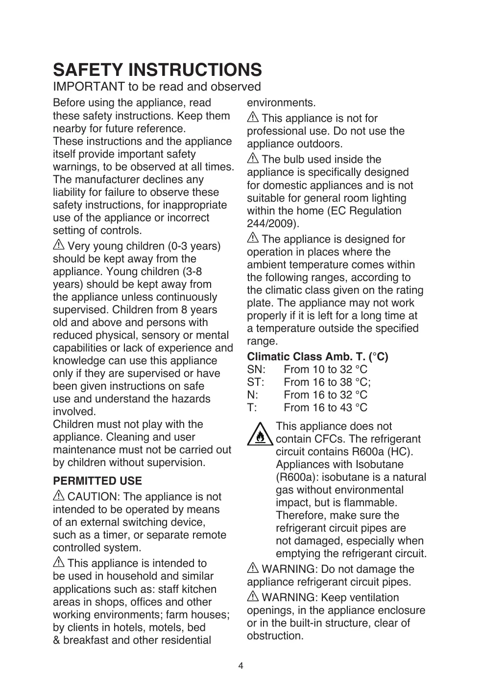 This appliance is not for professional use. Do not use the appliance outdoors. The bulb used inside the appliance is specifically designed for domestic appliances and is not suitable for general room lighting within the home (EC Regulation 244/2009). The appliance is designed for operation in places where the ambient temperature comes within the following ranges, according to the climatic class given on the rating plate. The appliance may not work properly if it is left for a long time at a temperature outside the specified range. Climatic Class Amb. T. (°C) SN: From 10 to 32 °C ST: From 16 to 38 °C; N: From 16 to 32 °C T: