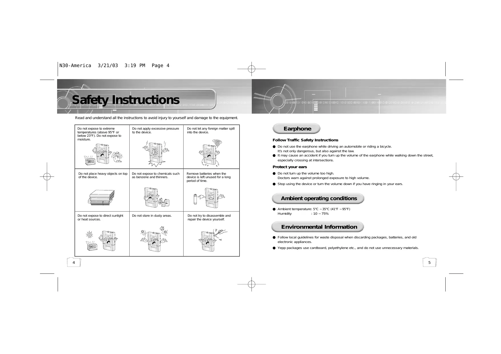 N30-America 3/21/03 3:19 PM Page 4 Safety Instructions Read and understand all the instructions to avoid injury to yourself and damage to the equipment. Do not expose to extreme temperatures (above 95°F or below 23°F). Do not expose to moisture. Do not apply excessive pressure to the device. Do not let any foreign matter spill into the device. Earphone Follow Traffic Safety Instructions ● Do not use the earphone while driving an automobile or riding a bicycle. It’s not only dangerous, but also against the law. ● It may cause an accident if you turn up the volume of the earphone while walking down the street, especially crossing at intersections. Protect your ears Do not place heavy objects on top of the device. Do not expose to chemicals such as benzene and thinners. Remove batteries when the device is left unused for a long period of time. ● Do not turn up the volume too high. Doctors warn against prolonged exposure to high volume. ● Stop using the device or turn the volume down if you have ringing in your ears. Ambient operating conditions Do not expose to direct sunlight or heat sources. Do not store in dusty areas. Do not try to disassemble and repair the device yourself. ● Ambient temperature: 5°C ~ 35°C (41°F ~ 95°F) Humidity : 10 ~ 75% Environmental Information ● Follow local guidelines for waste disposal when discarding packages, batteries, and old electronic appliances. ● Yepp packages use cardboard, polyethylene etc., and do not use unnecessary materials.