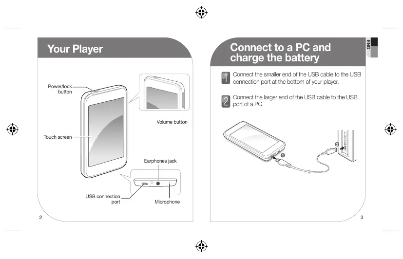 GM68-01101C (REV.1.0) The user manual and the installation program are stored in your player. Refer to page 4. Fully charge the battery before using your player for the first time. ENG Connect to a PC and charge the battery Your Player Connect the smaller end of the USB cable to the USB connection port at the bottom of your player. Power/lock button Connect the larger end of the USB cable to the USB port of a PC.• Volume button Touch screen Earphones jack USB connection port
