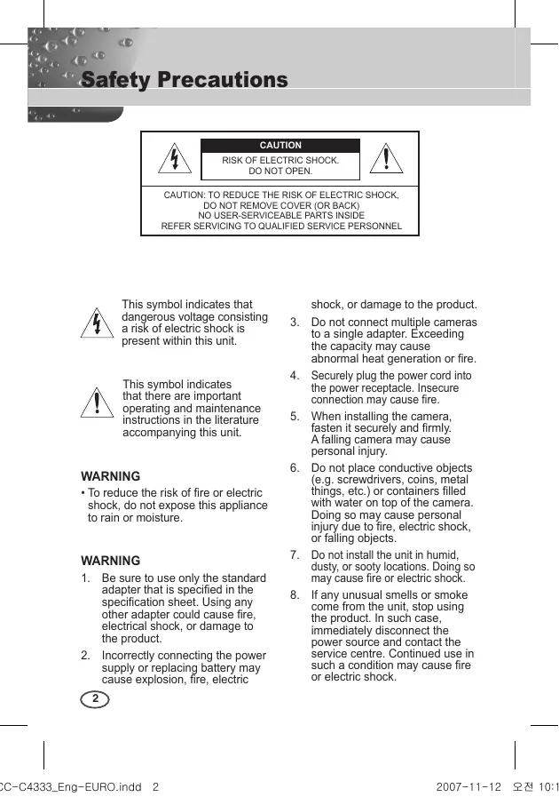 3. Do not connect multiple cameras to a single adapter. Exceeding the capacity may cause abnormal heat generation or fire. 4. Securely plug the power cord into the power receptacle. Insecure connection may cause fire. 5. When installing the camera, fasten it securely and firmly. A falling camera may cause personal injury. 6. Do not place conductive objects (e.g. screwdrivers, coins, metal things, etc.) or containers filled with water on top of the camera. Doing so may cause personal injury due to fire, electric shock, or falling objects. 7. Do not install the unit in humid, dusty, or sooty locations. Doing so may cause fire or electric shock. 8. If any unusual smells or smoke come from the unit, stop using the product. In such case, immediately disconnect the power source and contact the service centre. Continued use in such a condition may cause fire or electric shock.