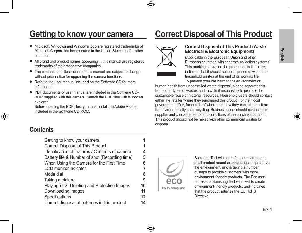 Microsoft, Windows and Windows logo are registered trademarks of Microsoft Corporation incorporated in the United States and/or other countries All brand and product names appearing in this manual are registered trademarks of their respective companies. The contents and illustrations of this manual are subject to change without prior notice for upgrading the camera functions. Refer to the user manual included on the Software CD for more information. PDF documents of user manual are included in the Software CDROM supplied with this camera. Search the PDF files with Windows explorer. Before opening the PDF files, you must install the Adobe Reader included in the Software CD-ROM. Contents Getting to know your camera Correct Disposal of This Product Identification of features / Contents of camera Battery life & Number of shot (Recording time) When Using the Camera for the First Time LCD monitor indicator Mode dial Taking a picture Playingback, Deleting and Protecting Images Downloading images Specifications Correct disposal of batteries in this product