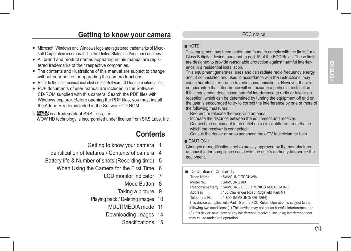 Ê NOTE : This equipment has been tested and found to comply with the limits for a Class B digital device, pursuant to part 15 of the FCC Rules. These limits are designed to provide reasonable protection against harmful interference in a residential installation. This equipment generates, uses and can radiate radio frequency energy and, if not installed and used in accordance with the instructions, may cause harmful interference to radio communications. However, there is no guarantee that interference will not occur in a particular installation. If this equipment does cause harmful interference to radio or television reception, which can be determined by turning the equipment off and on, the user is encouraged to try to correct the interference by one or more of the following measures: - Reorient or relocate the receiving antenna. - Increase the distance between the equipment and receiver. - Connect the equipment to an outlet on a circuit different from that to which the receiver is connected. - Consult the dealer or an experienced radio/TV technician for help. Ê CAUTION : Changes or modifications not expressly approved by the manufacturer responsible for compliance could void the user’s authority to operate the equipment. Ê Declaration of Conformity Trade Name : SAMSUNG TECHWIN Model No. : SAMSUNG i80 Responsible Party : SAMSUNG ELECTRONICS AMERICA INC. Address : 105 Challenger Road Ridgefield Park NJ Telephone No. : 1-800-SAMSUNG(726-7864) This device complies with Part 15 of the FCC Rules. Operation is subject to the following two conditions: (1) This device may not cause harmful interference, and (2) this device must accept any interference received, including interference that may cause undesired operation.