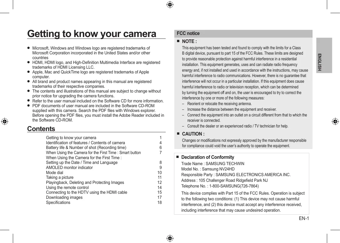 Declaration of Conformity Trade Name : SAMSUNG TECHWIN Model No. : Samsung NV24HD Responsible Party : SAMSUNG ELECTRONICS AMERICA INC. Address : 105 Challenger Road Ridgefield Park NJ Telephone No. : 1-800-SAMSUNG(726-7864) This device complies with Part 15 of the FCC Rules. Operation is subject to the following two conditions: (1) This device may not cause harmful interference, and (2) this device must accept any interference received, including interference that may cause undesired operation. EN-1 ENGLISH