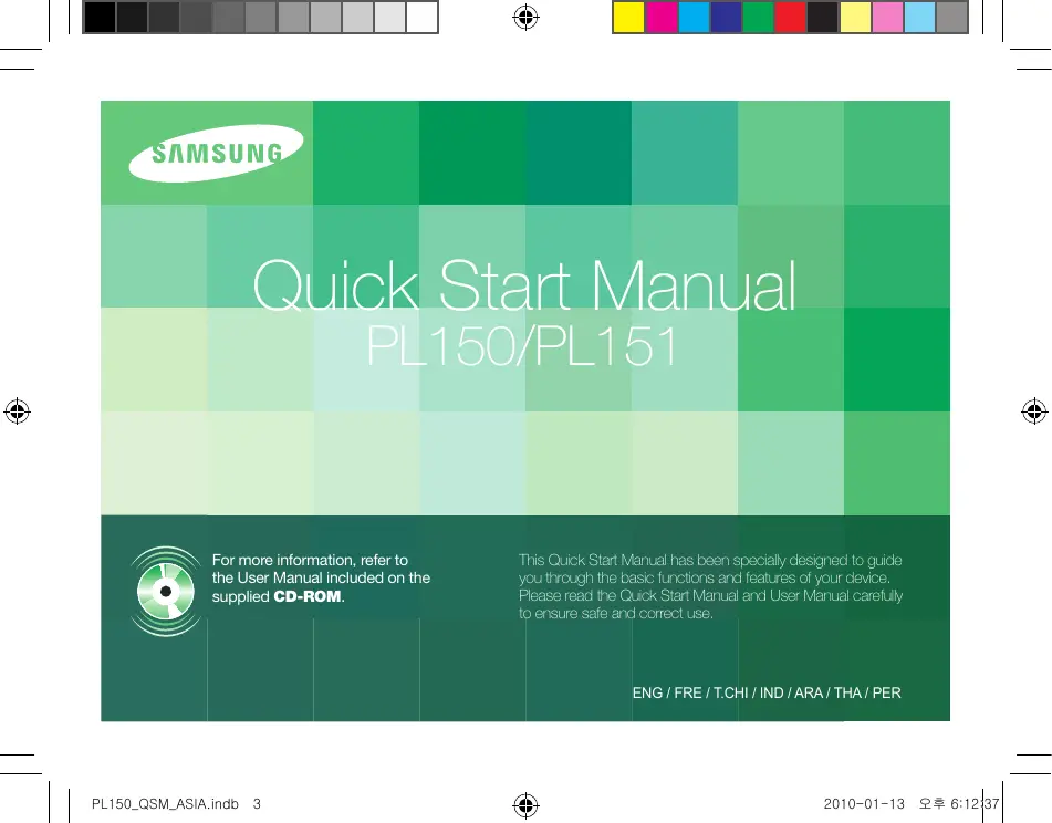 Quick Start Manual PL150/PL151 For more information, refer to the User Manual included on the supplied CD-ROM. This Quick Start Manual has been specially designed to guide you through the basic functions and features of your device. Please read the Quick Start Manual and User Manual carefully to ensure safe and correct use. ENG / FRE / T.CHI / IND / ARA / THA / PER PL150_QSM_ASIA.indb 3 2010-01-13 오후 6:12:37 Contents Health and safety information Health and safety information… 2