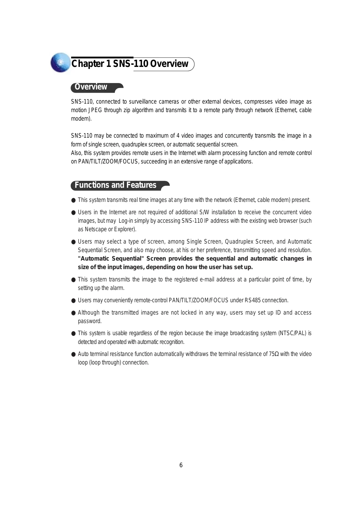 Overview SNS-110, connected to surveillance cameras or other external devices, compresses video image as motion JPEG through zip algorithm and transmits it to a remote party through network (Ethernet, cable modem). SNS-110 may be connected to maximum of 4 video images and concurrently transmits the image in a form of single screen, quadruplex screen, or automatic sequential screen. Also, this system provides remote users in the Internet with alarm processing function and remote control on PAN/TILT/ZOOM/FOCUS, succeeding in an extensive range of applications. Functions and Features ● This system transmits real time images at any time with the network (Ethernet, cable modem) present. ● Users in the Internet are not required of additional S/W installation to receive the concurrent video images, but may Log-in simply by accessing SNS-110 IP address with the existing web browser (such as Netscape or Explorer). ● Users may select a type of screen, among Single Screen, Quadruplex Screen, and Automatic Sequential Screen, and also may choose, at his or her preference, transmitting speed and resolution. "Automatic Sequential" Screen provides the sequential and automatic changes in size of the input images, depending on how the user has set up. ● This system transmits the image to the registered e-mail address at a particular point of time, by setting up the alarm. ● Users may conveniently remote-control PAN/TILT/ZOOM/FOCUS under RS485 connection. ● Although the transmitted images are not locked in any way, users may set up ID and access password. ● This system is usable regardless of the region because the image broadcasting system (NTSC/PAL) is detected and operated with autornatic recognition. ● Auto terminal resistance function automatically withdraws the terminal resistance of 75Ω with the video loop (loop through) connection.