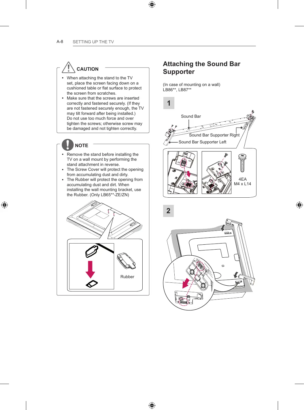 Sound Bar Sound Bar Supporter Right Sound Bar Supporter Left NOTE yy Remove the stand before installing the TV on a wall mount by performing the stand attachment in reverse. yy The Screw Cover will protect the opening from accumulating dust and dirty. yy The Rubber will protect the opening from accumulating dust and dirt. When installing the wall mounting bracket, use the Rubber. (Only LB65**-ZE/ZN) 4EA M4 x L14