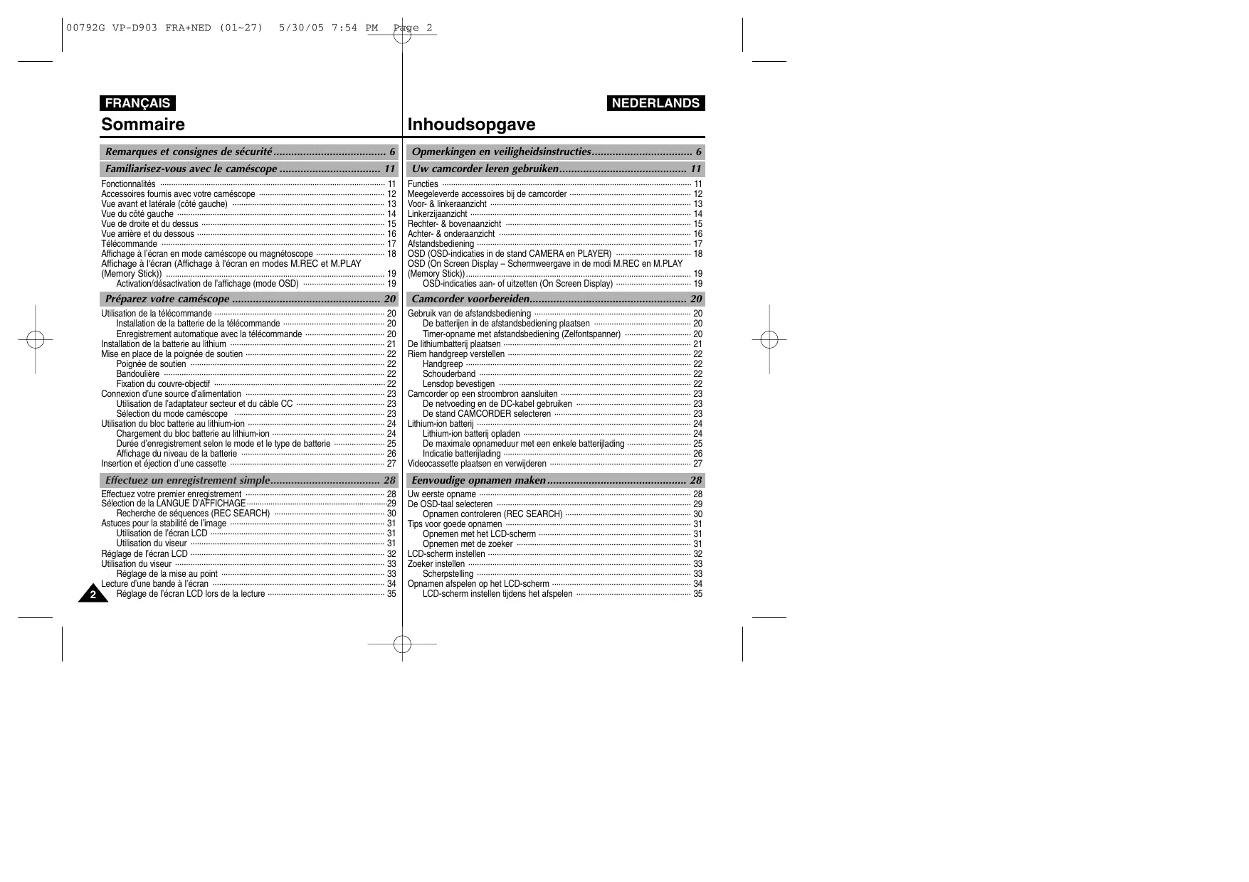 - Uw eerste opname ································································································ 28 De OSD-taal selecteren ························································································ 29 Opnamen controleren (REC SEARCH) ························································· 30 Tips voor goede opnamen ···················································································· 31 Opnemen met het LCD-scherm ····································································· 31 Opnemen met de zoeker ··············································································· 31 LCD-scherm instellen ···························································································· 32 Zoeker instellen ····································································································· 33 Scherpstelling ································································································· 33 Opnamen afspelen op het LCD-scherm ······························································· 34 LCD-scherm instellen tijdens het afspelen ···················································· 35 00792G VP-D903 FRA+NED (01~27) 5/30/05 7:54 PM Page 3 FRANÇAIS NEDERLANDS Sommaire Inhoudsopgave Réglage du volume du haut-parleur ····································································· 35 Geluidsweergave luidspreker instellen ································································· 35 Fonctions du mode menu p. 36