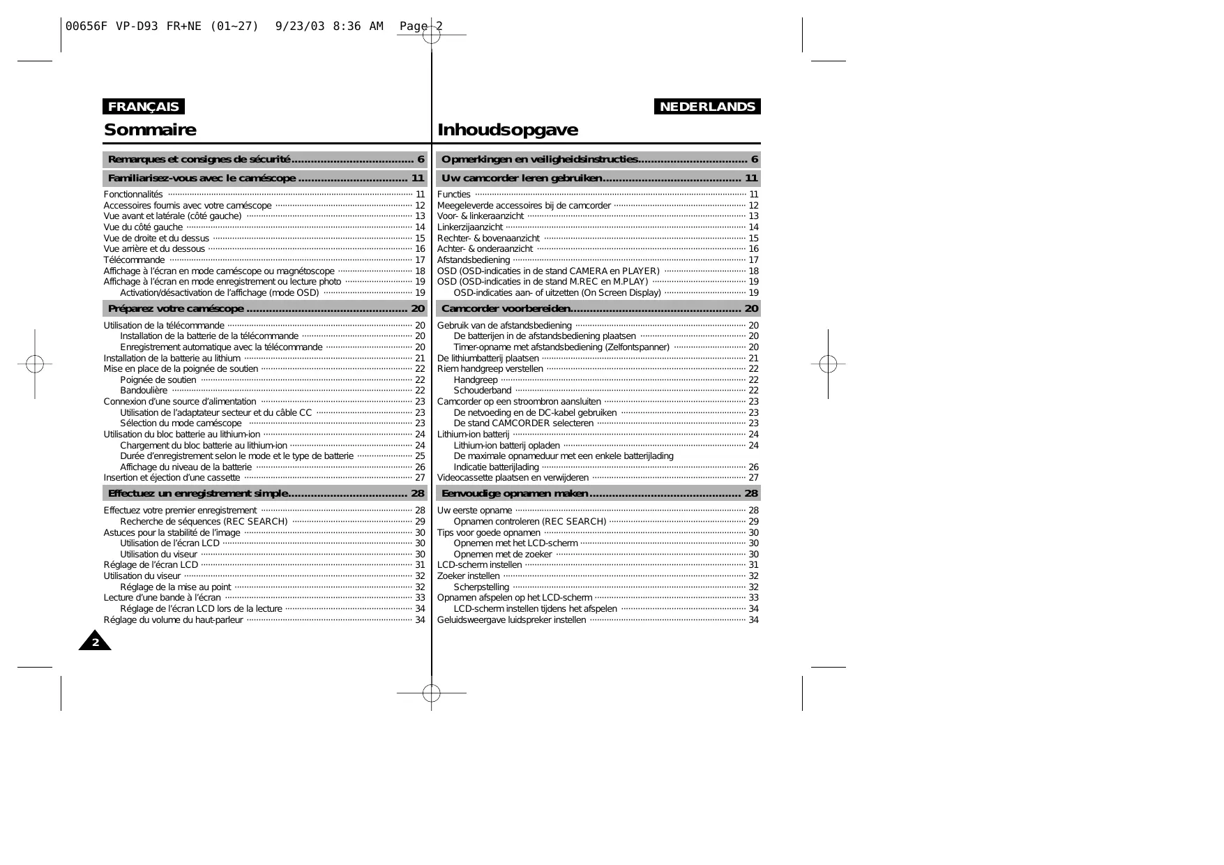 - Effectuez votre premier enregistrement ······························································· 28 Recherche de séquences (REC SEARCH) ·················································· 29 Astuces pour la stabilité de l’image ······································································ 30 Utilisation de l’écran LCD ··············································································· 30 Utilisation du viseur ························································································ 30 Réglage de l’écran LCD ························································································ 31 Utilisation du viseur ······························································································· 32 Réglage de la mise au point ·········································································· 32 Lecture d’une bande à l’écran ·············································································· 33 Réglage de l’écran LCD lors de la lecture ····················································· 34 Réglage du volume du haut-parleur ····································································· 34 Uw eerste opname ································································································ 28 Opnamen controleren (REC SEARCH) ························································· 29 Tips voor goede opnamen ···················································································· 30 Opnemen met het LCD-scherm ····································································· 30 Opnemen met de zoeker ··············································································· 30 LCD-scherm instellen ···························································································· 31 Zoeker instellen ····································································································· 32 Scherpstelling ································································································· 32 Opnamen afspelen op het LCD-scherm ······························································· 33 LCD-scherm instellen tijdens het afspelen ···················································· 34 Geluidsweergave luidspreker instellen ································································· 34 00656F VP-D93 FR+NE (01~27) 9/23/03 8:36 AM Page 3 FRANÇAIS Sommaire NEDERLANDS Inhoudsopgave Fonctions du mode menu p. 35