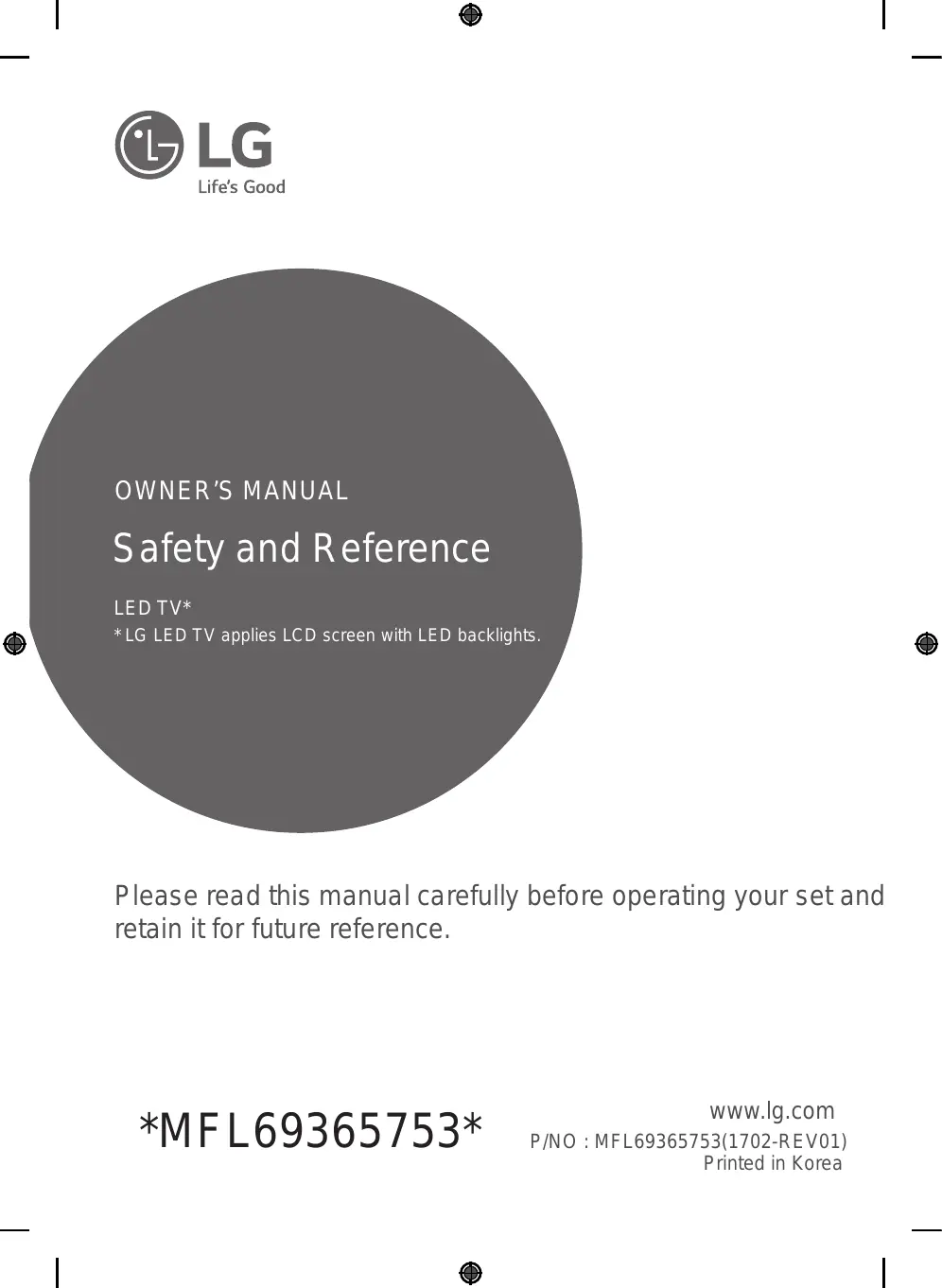 - LG LED TV applies LCD screen with LED backlights. Please read this manual carefully before operating your set and retain it for future reference. *MFL69365753* www.lg.com P/NO : MFL69365753(1702-REV01) Printed in Korea t Make sure to connect Mains cable to compliant AC mains socket with Grounded earth pin. (Except for devices which are not grounded on earth.) Otherwise possibility you may be electrocuted or injured. t Insert power cable plug completely into wall socket otherwise CAUTION not secured completely into socket, re ignition may break out.
