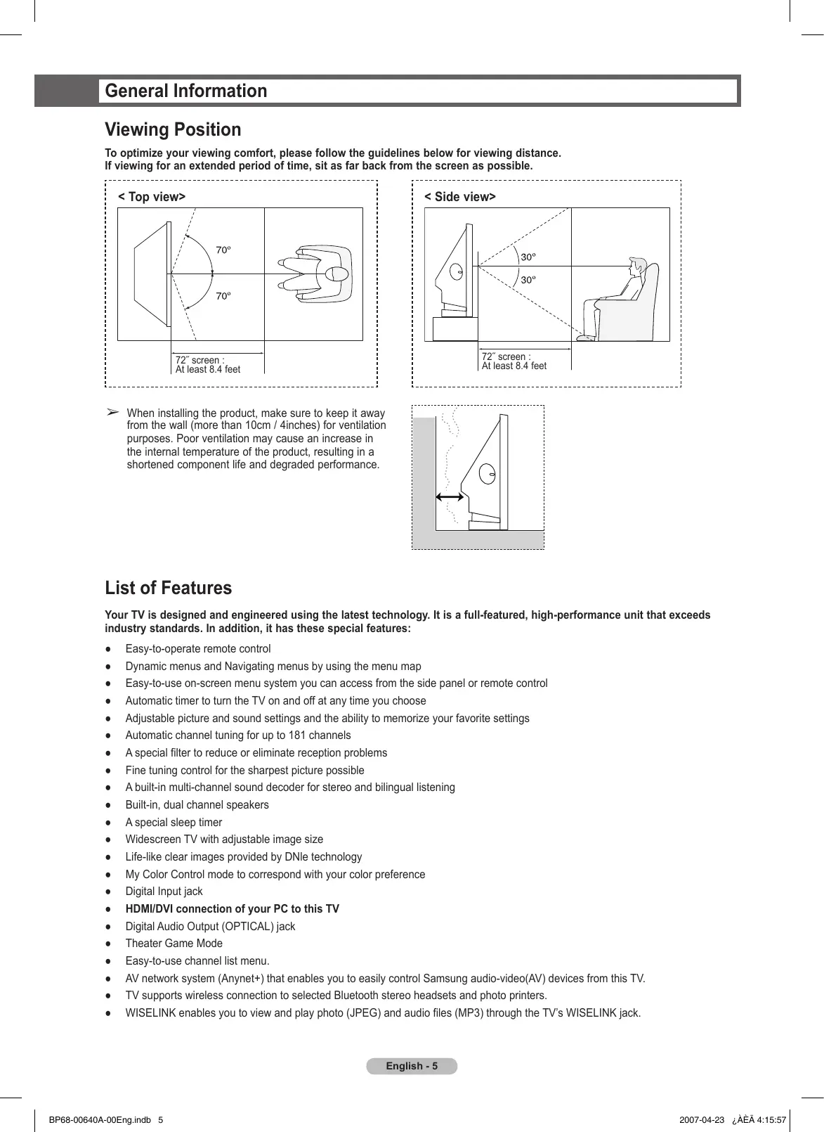 - Technical Specifications English - 4 BP68-00640A-00Eng.indb 4 2007-04-23 ¿ÀÈÄ 4:15:57 General Information Viewing Position To optimize your viewing comfort, please follow the guidelines below for viewing distance. If viewing for an extended period of time, sit as far back from the screen as possible. < Top view> < Side view> 72˝ screen : At least 8.4 feet 72˝ screen : At least 8.4 feet ➢ When installing the product, make sure to keep it away from the wall (more than 10cm / 4inches) for ventilation purposes. Poor ventilation may cause an increase in the internal temperature of the product, resulting in a shortened component life and degraded performance. List of Features Your TV is designed and engineered using the latest technology. It is a full-featured, high-performance unit that exceeds industry standards. In addition, it has these special features: p. 88