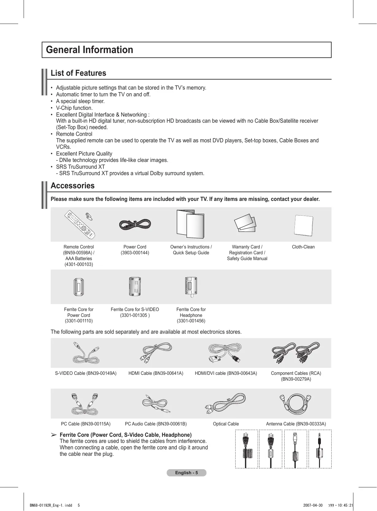 Please make sure the following items are included with your TV. If any items are missing, contact your dealer. Remote Control (BN59-00598A) / AAA Batteries (4301-000103) Power Cord (3903-000144) Owner’s Instructions / Quick Setup Guide Ferrite Core for Power Cord (3301-001110) Ferrite Core for S-VIDEO (3301-001305 ) Ferrite Core for Headphone (3301-001456) Warranty Card / Registration Card / Safety Guide Manual Cloth-Clean The following parts are sold separately and are available at most electronics stores. S-VIDEO Cable (BN39-00149A) HDMI Cable (BN39-00641A) HDMI/DVI cable (BN39-00643A) Component Cables (RCA) (BN39-00279A) PC Cable (BN39-00115A) PC Audio Cable (BN39-00061B) Optical Cable Antenna Cable (BN39-00333A)