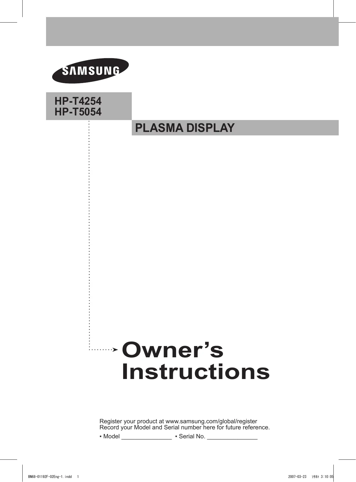 HP-T4254 HP-T5054 PLASMA DISPLAY Owner’s Instructions Register your product at www.samsung.com/global/register Record your Model and Serial number here for future reference.