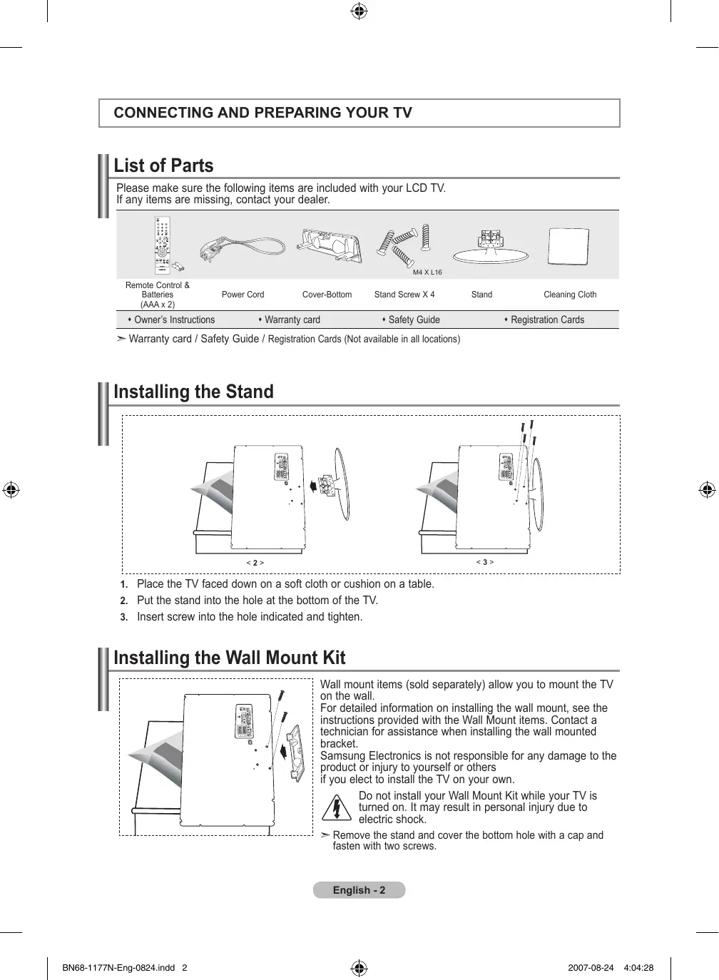 Setting and Displaying the Current Time...................14 Setting the Sleep Timer.............................................14 Switching the Television On and Off Automatically.... 15 Symbol Press Important Note One-Touch Button English - BN68-1177N-Eng-0824.indd 1 2007-08-24 4:04:27 Connecting and Preparing Your TV List of Parts Please make sure the following items are included with your LCD TV. If any items are missing, contact your dealer. M4 X L16 Remote Control & Batteries (AAA x 2) Owner’s Instructions Power Cord Cover-Bottom Stand Screw X 4 Warranty card Stand Safety Guide Cleaning Cloth Registration Cards ➣ Warranty card / Safety Guide / Registration Cards (Not available in all locations) Installing the Stand <3> <2>