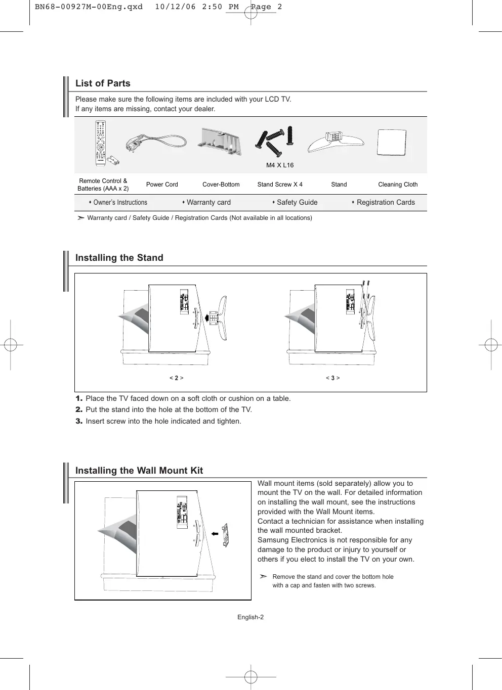 Setting and Displaying the Current Time..............14 Setting the Sleep Timer ........................................14 Switching the Television On and Off Automatically......................................15 Symbol English-1 Press Important Note One-Touch Button BN68-00927M-00Eng.qxd 10/12/06 2:50 PM Page 2 List of Parts Please make sure the following items are included with your LCD TV. If any items are missing, contact your dealer. M4 X L16 Remote Control & Batteries (AAA x 2) Power Cord Owner’s Instructions Cover-Bottom Stand Screw X 4 Warranty card Stand Safety Guide Cleaning Cloth Registration Cards Warranty card / Safety Guide / Registration Cards (Not available in all locations) Installing the Stand <2> <3>