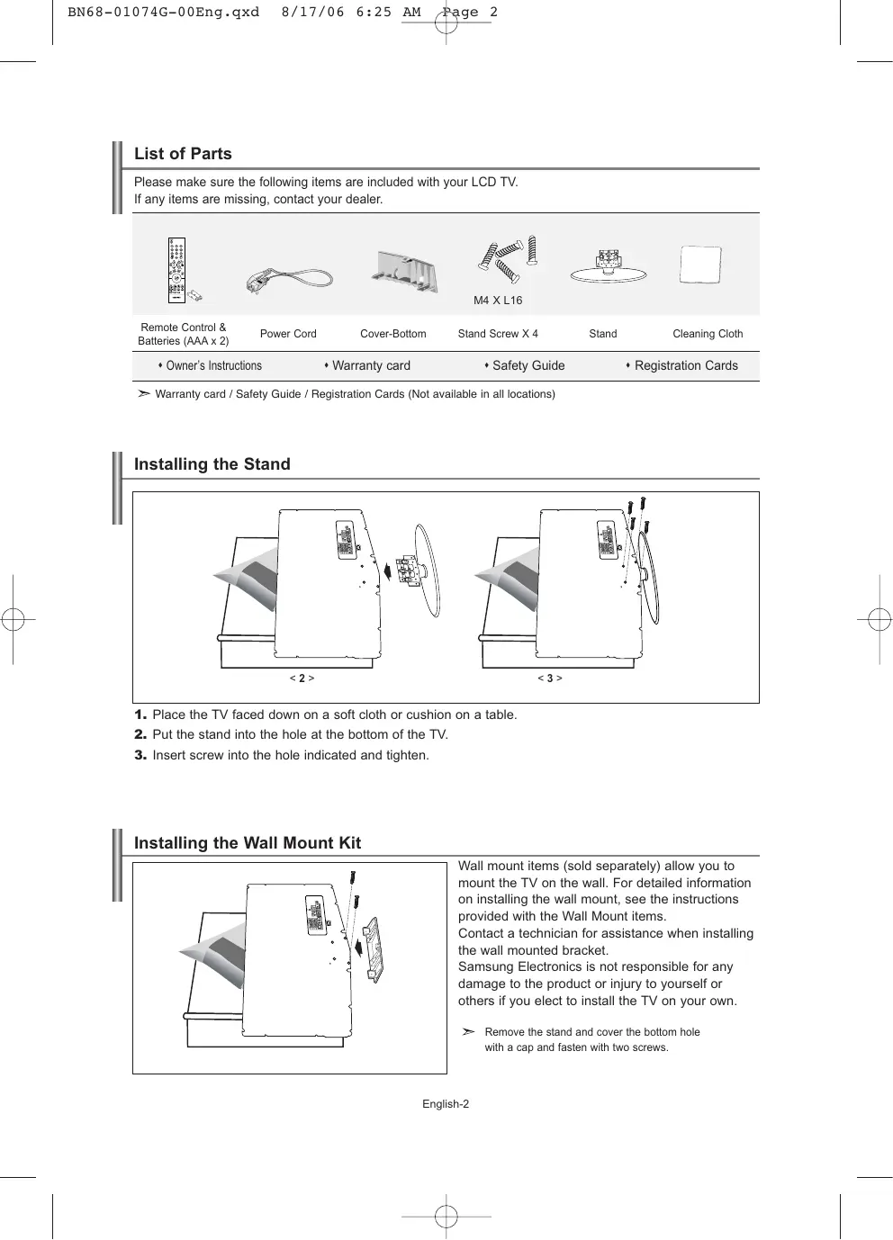Setting and Displaying the Current Time..............14 Setting the Sleep Timer ........................................14 Switching the Television On and Off Automatically......................................15 Symbol English-1 Press Important Note One-Touch Button BN68-01074G-00Eng.qxd 8/17/06 6:25 AM Page 2 List of Parts Please make sure the following items are included with your LCD TV. If any items are missing, contact your dealer. M4 X L16 Remote Control & Batteries (AAA x 2) Power Cord Owner’s Instructions Cover-Bottom Stand Screw X 4 Warranty card Safety Guide Stand Cleaning Cloth Registration Cards Warranty card / Safety Guide / Registration Cards (Not available in all locations) Installing the Stand <2> <3>