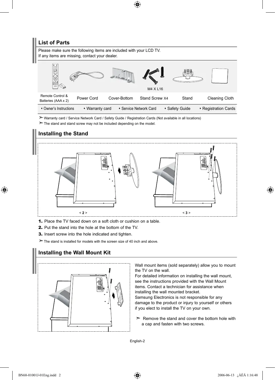 - Technical and Environmental Specifications One-Touch Button English- 2006-06-13 ¿ÀÈÄ 1:16:46 List of Parts Please make sure the following items are included with your LCD TV. If any items are missing, contact your dealer. M4 X L16 Remote Control & Batteries (AAA x 2) Owner’s Instructions Power Cord Cover-Bottom Warranty card Stand Screw X4 Service Network Card Stand Safety Guide Cleaning Cloth Registration Cards Warranty card / Service Network Card / Safety Guide / Registration Cards (Not available in all locations) The stand and stand screw may not be included depending on the model. Installing the Stand <2> <3> p. 26
