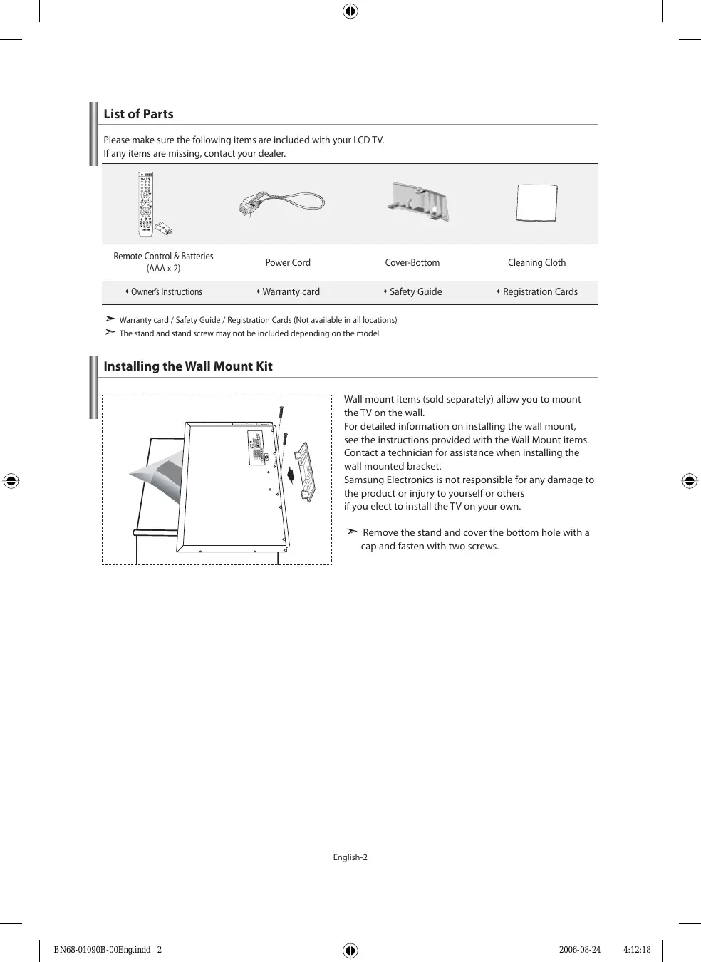 Setting and Displaying the Current Time ........................ 20 Setting the Sleep Timer.......................................................... 21 Switching the Television On and Off Automatically ..................................................... 21 Symbol Press Important Note One-Touch Button English-1 BN68-01090B-00Eng.indd 1 2006-08-24 4:12:10 List of Parts Please make sure the following items are included with your LCD TV. If any items are missing, contact your dealer. Remote Control & Batteries (AAA x 2) Power Cord Cover-Bottom Cleaning Cloth Owner’s Instructions Warranty card Safety Guide Registration Cards Warranty card / Safety Guide / Registration Cards (Not available in all locations) The stand and stand screw may not be included depending on the model. Installing the Wall Mount Kit Wall mount items (sold separately) allow you to mount the TV on the wall. For detailed information on installing the wall mount, see the instructions provided with the Wall Mount items. Contact a technician for assistance when installing the wall mounted bracket. Samsung Electronics is not responsible for any damage to the product or injury to yourself or others if you elect to install the TV on your own. Remove the stand and cover the bottom hole with a cap and fasten with two screws. English-2 BN68-01090B-00Eng.indd 2 2006-08-24 4:12:18 Viewing the Control Panel The product colour and shape may vary depending on the model. SOURCE Toggles between all the available input sources (TV, Ext.1, Ext.2, AV, S-Video, Component, PC, HDMI1, HDMI2). In the on-screen menu, use this button as you use the ENTER/OK button on the remote control. MENU Press to see an on-screen menu of your TV’s features. Press to decrease or increase the volume. In the on-screen menu, use the buttons as you use the and buttons on the remote control. Press to change channels. buttons In the on-screen menu, use the as you use the and buttons on the remote control. (Without the Remote Control, you can turn on the TV by using the Channel buttons.) Speakers (Power) Press to turn the TV on and off. Power Indicator Blinks and turns off when the power is on and lights up in stand-by mode. Remote Control Sensor Aim the remote control towards this spot on the TV. English-3 BN68-01090B-00Eng.indd 3 2006-08-24 4:12:19 Viewing the Connection Panel [Rear Panel Jacks] [Side Panel Jacks] Power Input Whenever you connect an external device to your TV, make sure that power on the unit is turned off. When connecting an external device, match the colour of the connection terminal to the cable. English-4 BN68-01090B-00Eng.indd 4 2006-08-24 4:12:20 Connecting an Aerial or Cable Television Network To view television channels correctly, a signal must be received by the set from one of the following sources: - An outdoor aerial / A cable television network / A satellite network Connecting HDMI/DVI - Supports connections between HDMI-connection-enabled AV devices (Set-Top Boxes, DVD players, AV receivers and digital TVs). - No additional Audio connection is needed for an HDMI to HDMI connection. What is HDMI? - “High Definition Multimedia Interface” allows the transmission of high definition digital video data and multiple channels of digital audio ( 5.1 channels). - The HDMI/DVI terminal supports DVI connection to an extended device with the appropriate cable (not supplied). The difference between HDMI and DVI is that the HDMI device is smaller in size, has the HDCP (High Bandwidth Digital Copy Protection) coding feature installed, and supports multi - channel digital audio. You should use the DVI-to-HDMI cable or DVI-HDMI Adapter for the connection, and the “R - AUDIO - L” terminal on DVI for sound output. - When connecting this product via HDMI or DVI to a Set Top Box, DVD Player or Games Console etc, make sure that it has been set to a compatible video output mode as shown in the table below. Failure to observe this may result in picture distortion, image breakup or no picture. Supported modes for DVI or HDMI 50 Hz 60 Hz Component 480i