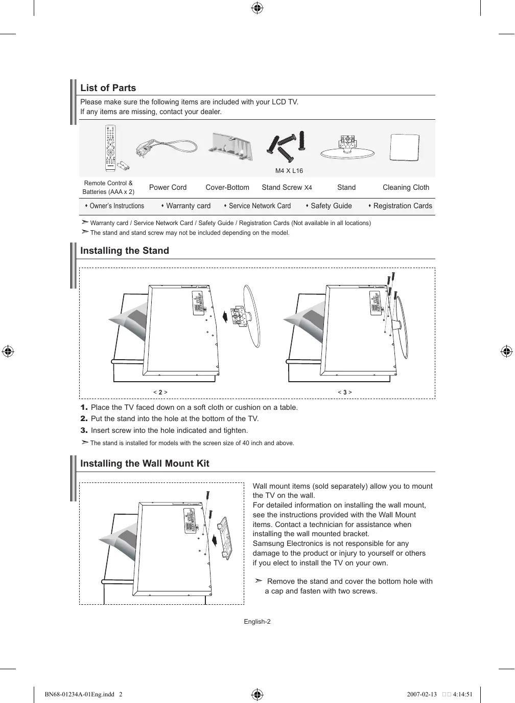- Technical and Environmental Specifications One-Touch Button English- 2007-02-13 4:14:49 List of Parts Please make sure the following items are included with your LCD TV. If any items are missing, contact your dealer. M4 X L16 Remote Control & Batteries (AAA x 2) Owner’s Instructions Power Cord Cover-Bottom Warranty card Stand Screw X4 Service Network Card Stand Safety Guide Cleaning Cloth Registration Cards Warranty card / Service Network Card / Safety Guide / Registration Cards (Not available in all locations) The stand and stand screw may not be included depending on the model. Installing the Stand <2> <3> p. 26