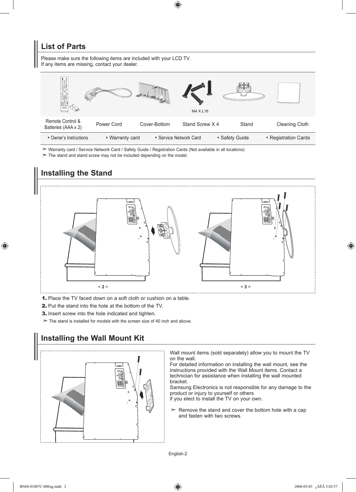 Cover-Bottom Warranty card Stand Screw X 4 Service Network Card Stand Safety Guide Cleaning Cloth Registration Cards Warranty card / Service Network Card / Safety Guide / Registration Cards (Not available in all locations) The stand and stand screw may not be included depending on the model. Installing the Stand <2> <3>