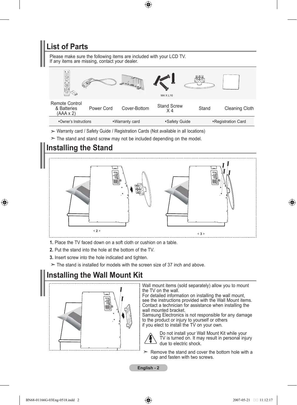 BN68-01166G-03Eng-0518.indd 2 2007-05-21 11:12:13 List of Parts Please make sure the following items are included with your LCD TV. If any items are missing, contact your dealer. M4 X L16 Remote Control & Batteries (AAA x 2) Power Cord Owner’s Instructions