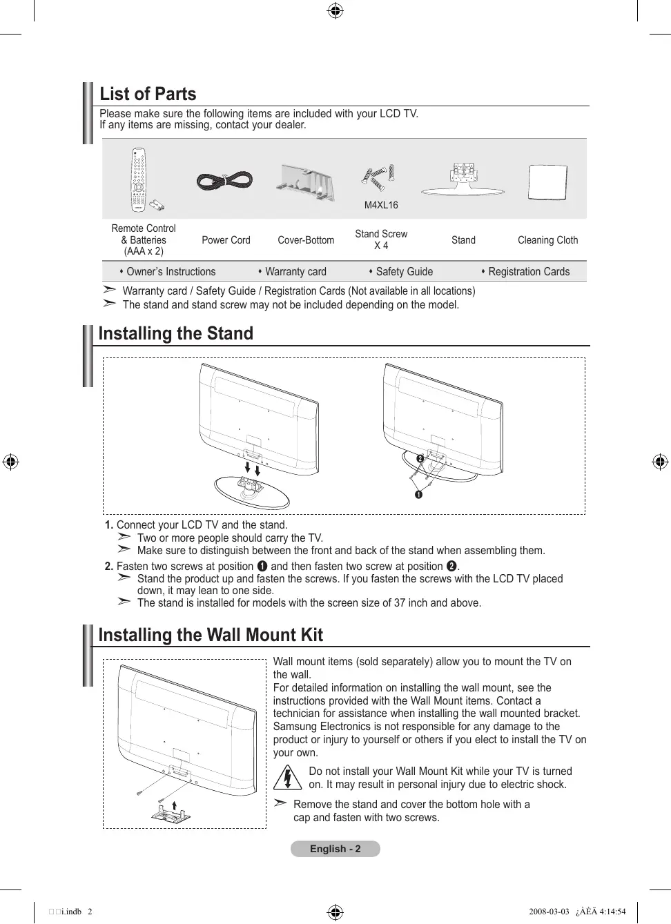 - Displaying still images from Video games and PC for longer than a certain period of time may produce partial after-images. To prevent this effect, reduce the ‘brightness’ and ‘contrast’ when displaying still images. © 2008 Samsung Electronics Co., Ltd. All rights reserved. i.indb 1 2008-03-03 ¿ÀÈÄ 4:14:53 English Contents Connecting and Preparing Your TV List of Parts......................................................... 2 Installing the Stand.............................................. 2 Installing the Wall Mount Kit................................ 2 Viewing the Control Panel................................... 3 Viewing the Connection Panel............................ 4 Viewing the Remote Control................................ 7 Installing Batteries in the Remote Control........... 8 Switching On and Off.......................................... 8 Placing Your Television in Standby Mode........... 8 Viewing the Menus.............................................. 9 Using the TOOLS Button..................................... 9 Plug & Play........................................................ 10 Setting the Channels Storing Channels Automatically.........................11 Storing Channels Manually............................... 12 Adding / Locking Channels............................... 13 Sorting the Stored Channels............................. 14 Assigning Channels Names.............................. 14 Fine Tuning Channel Reception........................ 15 LNA (Low Noise Amplifier)................................ 15 Setting the Picture Changing the Picture Standard......................... 16 Adjusting the Custom Picture............................ 17 Configuring Detailed Settings on the Picture.... 17 Resetting the Picture Settings to the Factory Defaults................................................ 18 Changing the Picture Options........................... 19 Setting the Sound Sound Features................................................. 21 Selecting the Sound Mode................................ 22 Connecting Headphones (Sold separately)...... 22 Setting the Time Setting and Displaying the Current Time........... 23 Setting the Sleep Timer..................................... 23 Switching the Television On and Off Automatically..................................................... 24 Function Description Choosing Your Language.................................. 24 Melody / Entertainment / Energy Saving . ........ 25 Selecting the Source......................................... 26 Editing the Input Source Names....................... 27 Symbol Press Note One-Touch Button USING The DTV FeATuRe Previewing the DTV Menu System................... 28 Updating the Channel List Automatically........... 29 Updating the Channel List Manually................. 29 Editing Your Favourite Channels....................... 30 Selecting Channel List...................................... 32 Displaying Programme Information................... 32 Viewing the EPG (Electronic Programme Guide) Information............................................ 33 Using the Scheduled List.................................. 34 Setting the Default Guide.................................. 34 Viewing All Channels and Favourite Channels..... 35 Adjusting the Menu Transparency..................... 35 Setting up the Parental Lock............................. 36 Setting the Subtitle............................................ 37 Setting the Subtitle Mode.................................. 37 Selecting the Audio Format............................... 37 Selecting the Audio Description........................ 38 Selecting the Digital Text (UK only)................... 38 Selecting the Time Zone (Spain only)............... 39 Viewing Product Information............................. 39 Checking the Signal Information....................... 40 Upgrading the Software.................................... 40 Viewing Common Interface............................... 41 Selecting the CI (Common Interface) Menu...... 41 Resetting........................................................... 42 Selecting the Preferred Language (Subtitle, Audio or Teletext)............................... 42 Preference............................................................ 43 Setting the PC Setting up Your PC Software (Based on Windows XP)................................... 44 Display Modes................................................... 44 Setting up the TV with your PC......................... 45 About Anynet+ What is Anynet+? ............................................. 46 Connecting Anynet+ Devices............................ 46 Setting Up Anynet+........................................... 47 Scanning and Switching between Anynet+ Devices............................................................. 48 Recording.......................................................... 50 Listening through a Receiver............................ 50 Check Points before Requesting Service.......... 51 Recommendations For Use Teletext Feature................................................ 52 Wall-Mount Adjustment (Sold separately) (depending on the model)................................. 54 Using the Anti-Theft Kensington Lock (depending on the model)................................. 55 Troubleshooting: Before Contacting Service Personnel............................................. 56 Technical and Environmental Specifications .... 57 English - 1 i.indb 1 2008-03-03 ¿ÀÈÄ 4:14:53 List of Parts Please make sure the following items are included with your LCD TV. If any items are missing, contact your dealer. M4XL16 Remote Control & Batteries (AAA x 2) Power Cord Owner’s Instructions