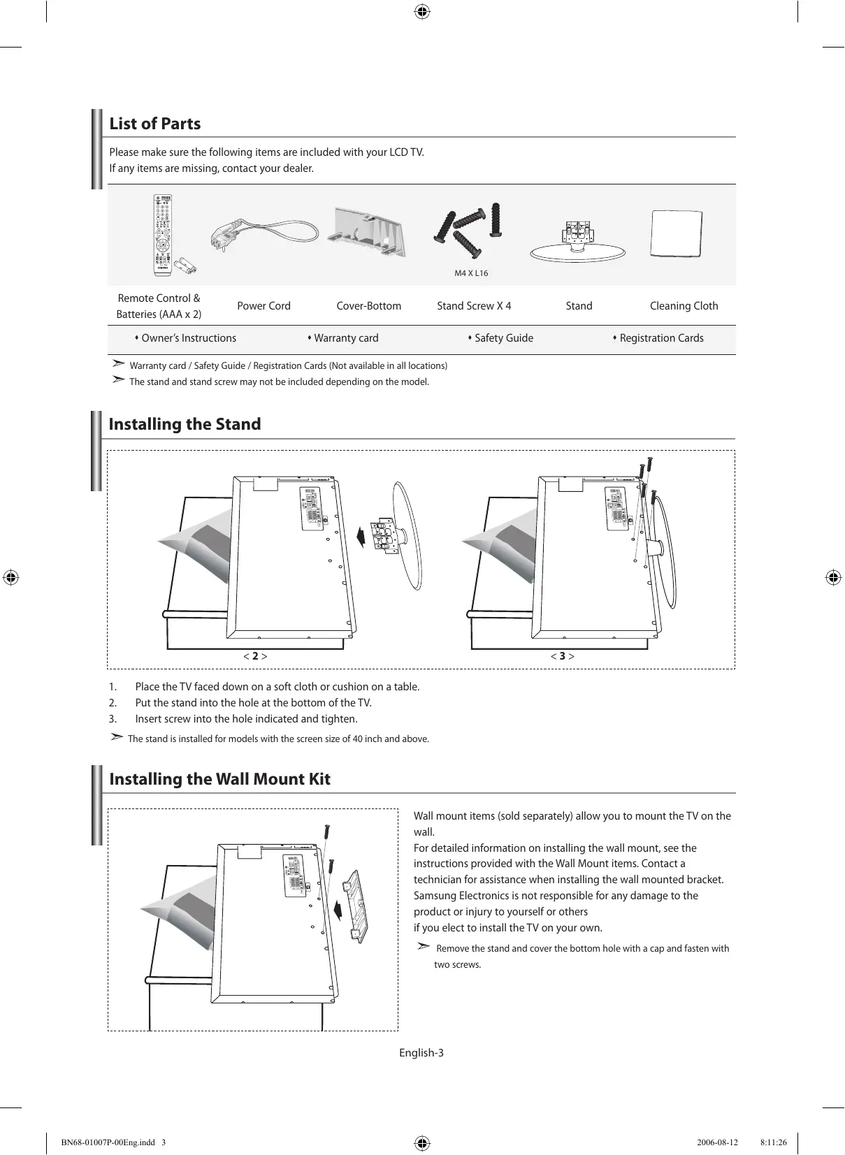 <3> Place the TV faced down on a soft cloth or cushion on a table. Put the stand into the hole at the bottom of the TV. Insert screw into the hole indicated and tighten. The stand is installed for models with the screen size of 40 inch and above. Installing the Wall Mount Kit Wall mount items (sold separately) allow you to mount the TV on the wall. For detailed information on installing the wall mount, see the instructions provided with the Wall Mount items. Contact a technician for assistance when installing the wall mounted bracket. Samsung Electronics is not responsible for any damage to the product or injury to yourself or others if you elect to install the TV on your own. Remove the stand and cover the bottom hole with a cap and fasten with two screws. English-3 BN68-01007P-00Eng.indd 3 2006-08-12 8:11:26 Viewing the Control Panel The product colour and shape may vary depending on the model. SOURCE Toggles between all the available input sources (TV, Ext.1, Ext.2, AV, S-Video, Component, PC, HDMI1, HDMI2, DTV). In the on-screen menu, use this button as you use the ENTER button on the remote control. MENU Press to see an on-screen menu of your TV’s features. Press to change channels. In the on-screen menu, use the buttons as you use the and buttons on the remote control. (Without the Remote Control, you can turn on the TV by using the Channel buttons.) Speakers (Power) Press to turn the TV on and off. Press to decrease or increase the volume. In the on-screen menu, use the buttons as you use the and buttons on the remote control. Power Indicator Blinks and turns off when the power is on and lights up in stand-by mode. Remote Control Sensor Aim the remote control towards this spot on the TV. English-4 BN68-01007P-00Eng.indd 4 2006-08-12 8:11:28 Viewing the Connection Panel [Rear Panel Jacks] [Side Panel Jacks] Power Input Whenever you connect an external device to your TV, make sure that power on the unit is turned off. When connecting an external device, match the colour of the connection terminal to the cable. Connecting an Aerial or Cable Television Network To view television channels correctly, a signal must be received by the set from one of the following sources: - An outdoor aerial / A cable television network / A satellite network Connecting HDMI/DVI - Supports connections between HDMI-connection-enabled AV devices (Set-Top Boxes, DVD players, AV receivers and digital TVs). - No additional Audio connection is needed for an HDMI to HDMI connection. What is HDMI? - “High Definition Multimedia interface” allows the transmission of high definition digital video data and multiple channels of digital audio ( 5.1 channels). - The HDMI/DVI terminal supports DVI connection to an extended device with the appropriate cable (not supplied). The difference between HDMI and DVI is that the HDMI device is smaller in size, has the HDCP (High Bandwidth Digital Copy Protection) coding feature installed, and supports multi - channel digital audio. You should use the DVI-to-HDMI cable or DVI-HDMI Adapter for the connection, and the “R - AUDIO - L” terminal on DVI for sound output. - When connecting this product via HDMI or DVI to a Set Top Box, DVD Player or Games Console etc, make sure that it has been set to a compatible video output mode as shown in the table below. Failure to observe this may result in picture distortion, image breakup or no picture. Supported modes for DVI or HDMI 50 Hz 60 Hz Component 480i