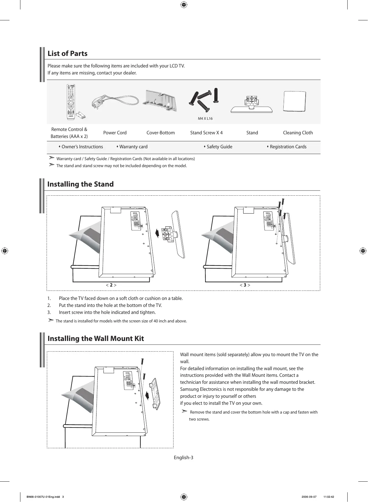<3> Place the TV faced down on a soft cloth or cushion on a table. Put the stand into the hole at the bottom of the TV. Insert screw into the hole indicated and tighten. The stand is installed for models with the screen size of 40 inch and above. Installing the Wall Mount Kit Wall mount items (sold separately) allow you to mount the TV on the wall. For detailed information on installing the wall mount, see the instructions provided with the Wall Mount items. Contact a technician for assistance when installing the wall mounted bracket. Samsung Electronics is not responsible for any damage to the product or injury to yourself or others if you elect to install the TV on your own. Remove the stand and cover the bottom hole with a cap and fasten with two screws. English-3 BN68-01007U-01Eng.indd 3 2006-09-07 11:02:42 Viewing the Control Panel The product colour and shape may vary depending on the model. SOURCE Toggles between all the available input sources (TV, Ext.1, Ext.2, AV, S-Video, Component, PC, HDMI1, HDMI2, DTV). In the on-screen menu, use this button as you use the ENTER button on the remote control. MENU Press to see an on-screen menu of your TV’s features. Press to change channels. In the on-screen menu, use the buttons as you use the and buttons on the remote control. (Without the Remote Control, you can turn on the TV by using the Channel buttons.) Speakers (Power) Press to turn the TV on and off. Press to decrease or increase the volume. In the on-screen menu, use the buttons as you use the and buttons on the remote control. Power Indicator Blinks and turns off when the power is on and lights up in stand-by mode. Remote Control Sensor Aim the remote control towards this spot on the TV. English-4 BN68-01007U-01Eng.indd 4 2006-09-07 11:02:58 Viewing the Connection Panel [Rear Panel Jacks] [Side Panel Jacks] Power Input Whenever you connect an external device to your TV, make sure that power on the unit is turned off. When connecting an external device, match the colour of the connection terminal to the cable. Connecting an Aerial or Cable Television Network To view television channels correctly, a signal must be received by the set from one of the following sources: - An outdoor aerial / A cable television network / A satellite network Connecting HDMI/DVI - Supports connections between HDMI-connection-enabled AV devices (Set-Top Boxes, DVD players, AV receivers and digital TVs). - No additional Audio connection is needed for an HDMI to HDMI connection. What is HDMI? - “High Definition Multimedia Interface” allows the transmission of high definition digital video data and multiple channels of digital audio ( 5.1 channels). - The HDMI/DVI terminal supports DVI connection to an extended device with the appropriate cable (not supplied). The difference between HDMI and DVI is that the HDMI device is smaller in size, has the HDCP (High Bandwidth Digital Copy Protection) coding feature installed, and supports multi - channel digital audio. You should use the DVI-to-HDMI cable or DVI-HDMI Adapter for the connection, and the “R - AUDIO - L” terminal on DVI for sound output. - When connecting this product via HDMI or DVI to a Set Top Box, DVD Player or Games Console etc, make sure that it has been set to a compatible video output mode as shown in the table below. Failure to observe this may result in picture distortion, image breakup or no picture. Supported modes for DVI or HDMI 50 Hz 60 Hz Component 480i