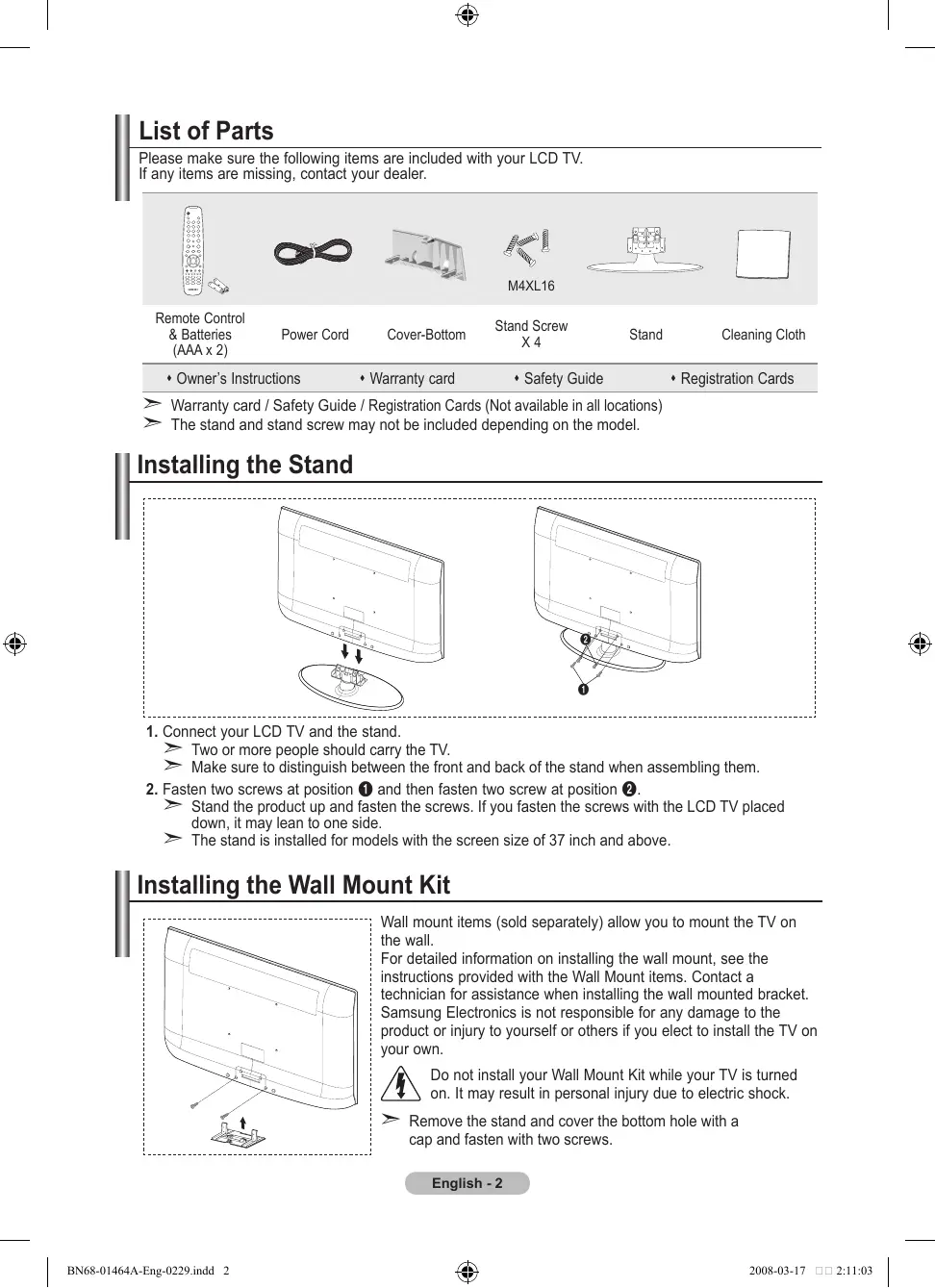 - Displaying still images from Video games and PC for longer than a certain period of time may produce partial after-images. To prevent this effect, reduce the ‘brightness’ and ‘contrast’ when displaying still images. © 2008 Samsung Electronics Co., Ltd. All rights reserved. BN68-01464A-Eng-0229.indd 1 2008-03-17 2:11:02 English Contents Connecting and Preparing Your TV List of Parts......................................................... 2 Installing the Stand.............................................. 2 Installing the Wall Mount Kit................................ 2 Viewing the Control Panel................................... 3 Viewing the Connection Panel............................ 4 Viewing the Remote Control................................ 7 Installing Batteries in the Remote Control........... 8 Switching On and Off.......................................... 8 Placing Your Television in Standby Mode........... 8 Viewing the Menus.............................................. 9 Using the TOOLS Button..................................... 9 Plug & Play........................................................ 10 Setting the Channels Storing Channels Automatically.........................11 Storing Channels Manually............................... 12 Adding / Locking Channels............................... 13 Sorting the Stored Channels............................. 14 Assigning Channels Names.............................. 14 Fine Tuning Channel Reception........................ 15 LNA (Low Noise Amplifier)................................ 15 Setting the Picture Changing the Picture Standard......................... 16 Adjusting the Custom Picture............................ 17 Configuring Detailed Settings on the Picture.... 17 Resetting the Picture Settings to the Factory Defaults................................................ 18 Changing the Picture Options........................... 19 Setting the Sound Sound Features................................................. 21 Selecting the Sound Mode................................ 22 Connecting Headphones (Sold separately)...... 22 Setting the Time Setting and Displaying the Current Time........... 23 Setting the Sleep Timer..................................... 23 Switching the Television On and Off Automatically..................................................... 24 Function Description Choosing Your Language.................................. 24 Melody / Entertainment / Energy Saving . ........ 25 Selecting the Source......................................... 26 Editing the Input Source Names....................... 27 Symbol Press Note One-Touch Button USING The DTV FeATuRe Previewing the DTV Menu System................... 28 Updating the Channel List Automatically........... 29 Updating the Channel List Manually................. 29 Editing Your Favourite Channels....................... 30 Selecting Channel List...................................... 32 Displaying Programme Information................... 32 Viewing the EPG (Electronic Programme Guide) Information............................................ 33 Using the Scheduled List.................................. 34 Setting the Default Guide.................................. 34 Viewing All Channels and Favourite Channels..... 35 Adjusting the Menu Transparency..................... 35 Setting up the Parental Lock............................. 36 Setting the Subtitle............................................ 37 Setting the Subtitle Mode.................................. 37 Selecting the Audio Format............................... 37 Selecting the Audio Description........................ 38 Selecting the Digital Text (UK only)................... 38 Selecting the Time Zone (Spain only)............... 39 Viewing Product Information............................. 39 Checking the Signal Information....................... 40 Upgrading the Software.................................... 40 Viewing Common Interface............................... 41 Selecting the CI (Common Interface) Menu...... 41 Resetting........................................................... 42 Selecting the Preferred Language (Subtitle, Audio or Teletext)............................... 42 Preference............................................................ 43 Setting the PC Setting up Your PC Software (Based on Windows XP)................................... 44 Display Modes................................................... 44 Setting up the TV with your PC......................... 45 About Anynet+ What is Anynet+? ............................................. 46 Connecting Anynet+ Devices............................ 46 Setting Up Anynet+........................................... 47 Scanning and Switching between Anynet+ Devices............................................................. 48 Recording.......................................................... 50 Listening through a Receiver............................ 50 Check Points before Requesting Service.......... 51 Recommendations For Use Teletext Feature................................................ 52 Wall-Mount Adjustment (Sold separately) (depending on the model)................................. 54 Using the Anti-Theft Kensington Lock (depending on the model)................................. 55 Troubleshooting: Before Contacting Service Personnel............................................. 56 Technical and Environmental Specifications .... 57 English - 1 BN68-01464A-Eng-0229.indd 1 2008-03-17 2:11:02 List of Parts Please make sure the following items are included with your LCD TV. If any items are missing, contact your dealer. M4XL16 Remote Control & Batteries (AAA x 2) Power Cord Owner’s Instructions
