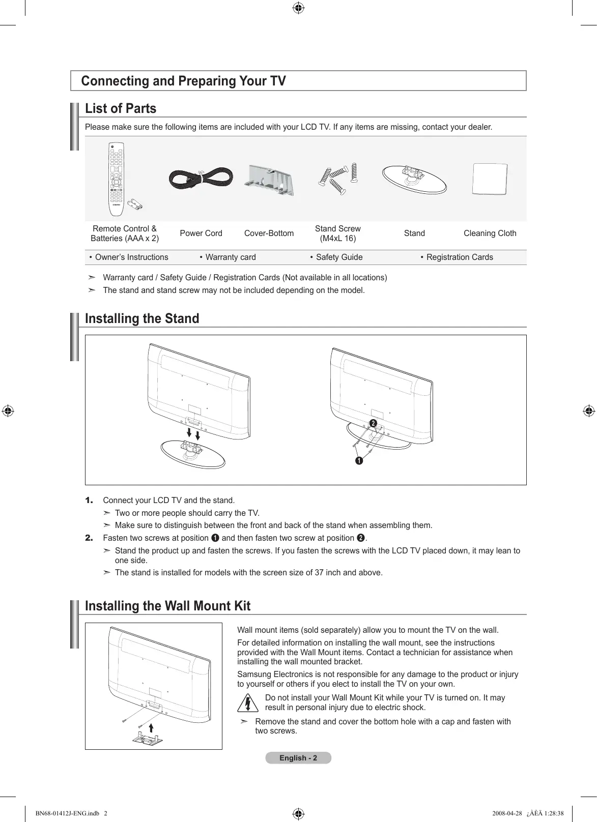 Connect your LCD TV and the stand. ➣ Two or more people should carry the TV. ➣ Make sure to distinguish between the front and back of the stand when assembling them. Fasten two screws at position 1 and then fasten two screw at position 2. ➣ Stand the product up and fasten the screws. If you fasten the screws with the LCD TV placed down, it may lean to one side. ➣ The stand is installed for models with the screen size of 37 inch and above. Installing the Wall Mount Kit Wall mount items (sold separately) allow you to mount the TV on the wall. For detailed information on installing the wall mount, see the instructions provided with the Wall Mount items. Contact a technician for assistance when installing the wall mounted bracket. Samsung Electronics is not responsible for any damage to the product or injury to yourself or others if you elect to install the TV on your own. o not install your Wall Mount Kit while your TV is turned on. It may result in personal injury due to electric shock. ➣ Remove the stand and cover the bottom hole with a cap and fasten with two screws. English - BN68-01412J-ENG.indb 2 2008-04-28 ¿ÀÈÄ 1:28:38 Viewing the Control Panel