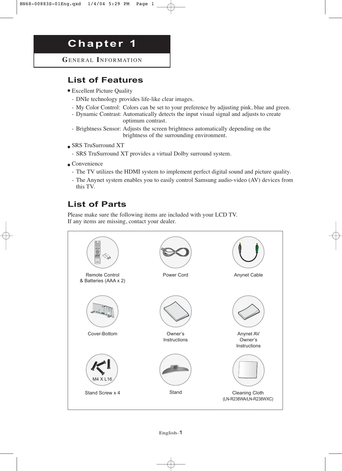 G E N E R A L I N F O R M AT I O N List of Features Excellent Picture Quality - DNIe technology provides life-like clear images. - My Color Control: Colors can be set to your preference by adjusting pink, blue and green. - Dynamic Contrast: Automatically detects the input visual signal and adjusts to create optimum contrast. - Brightness Sensor: Adjusts the screen brightness automatically depending on the brightness of the surrounding environment. SRS TruSurround XT - SRS TruSurround XT provides a virtual Dolby surround system. Convenience - The TV utilizes the HDMI system to implement perfect digital sound and picture quality. - The Anynet system enables you to easily control Samsung audio-video (AV) devices from this TV. List of Parts Please make sure the following items are included with your LCD TV. If any items are missing, contact your dealer. Remote Control & Batteries (AAA x 2) Power Cord Anynet Cable Cover-Bottom Owner’s Instructions Cleaning Cloth (LN-R238WA/LN-R238WXC) English-1 BN68-00883S-01Eng.qxd 1/4/04 5:29 PM Page 2 G E N E R A L I N F O R M AT I O N Familiarizing Yourself with Your New TV Buttons on the Lower-Right Part of the Panel The buttons on the lower-right panel control your TV’s basic features, including the on-screen menu. To use the more advanced features, you must use the remote control. - LN-R238WA - LN-R238WXC - LN-R237W1 Note: The product color may vary depending on the model. SOURCE (POWER) Displays a menu of all of the available input sources (TV, AV1, AV2, S-Video, Component 1, Component 2, PC, HDMI). In the on-screen menu, use this button as you use the ENTER button on the remote control. MENU Press to turn the TV on and off. POWER INDICATOR Blinks and turns off when the power is on and lights up in stand-by mode.