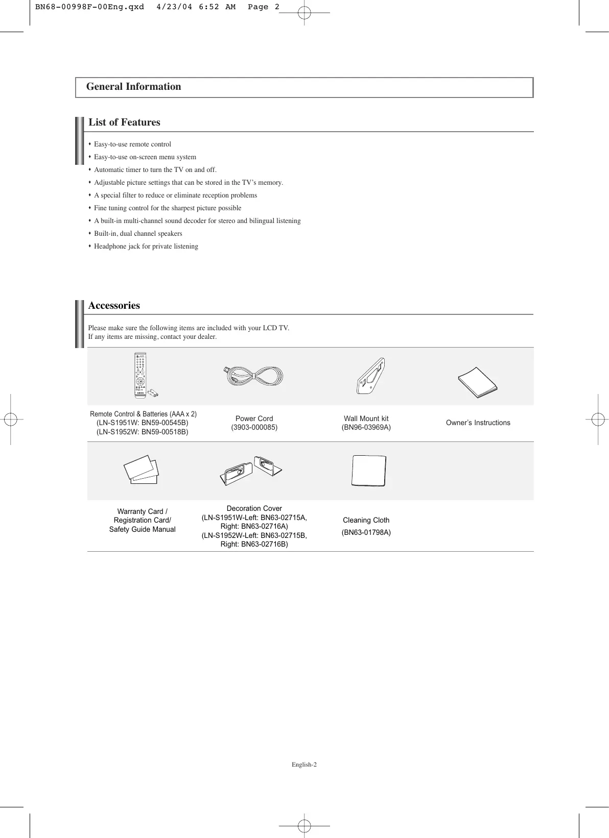 BN68-00998F-00Eng.qxd 4/23/04 6:52 AM Page 2 General Information List of Features Easy-to-use remote control Easy-to-use on-screen menu system Automatic timer to turn the TV on and off. Adjustable picture settings that can be stored in the TV’s memory. A special filter to reduce or eliminate reception problems Fine tuning control for the sharpest picture possible A built-in multi-channel sound decoder for stereo and bilingual listening Built-in, dual channel speakers Headphone jack for private listening Accessories Please make sure the following items are included with your LCD TV. If any items are missing, contact your dealer. Remote Control & Batteries (AAA x 2) (LN-S1951W: BN59-00545B) (LN-S1952W: BN59-00518B) Warranty Card / Registration Card/ Safety Guide Manual Power Cord (3903-000085) Wall Mount kit (BN96-03969A) Decoration Cover (LN-S1951W-Left: BN63-02715A, Right: BN63-02716A) (LN-S1952W-Left: BN63-02715B, Right: BN63-02716B) English-2 Cleaning Cloth (BN63-01798A) Owner’s Instructions BN68-00998F-00Eng.qxd 4/21/04 6:51 PM Page 3 Viewing the Control Panel The buttons on the lower-right panel control your TV’s basic features, including the on-screen menu. To use the more advanced features, you must use the remote control. The product color and shape may vary depending on the model. SOURCE Toggles between all the available input sources (TV, AV, S-Video, Component, PC, DVI). In the on-screen menu, use this button as you would use the ENTER button on the remote control. SPEAKERS (POWER) Press to turn the TV on and off. POWER INDICATOR Blinks and turns off when the power is on and lights up in standby mode. MENU Press to see an on-screen menu of your TV’s features.