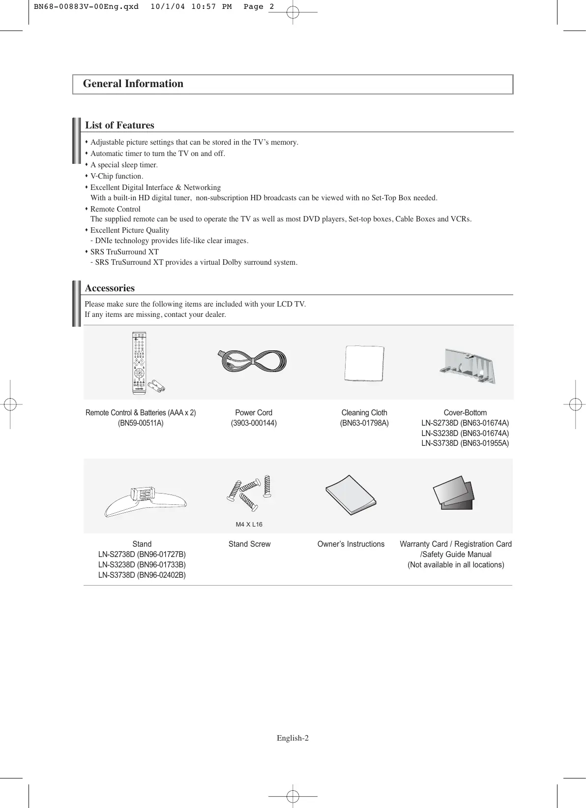 One-Touch Button English-1 List of Features Adjustable picture settings that can be stored in the TV’s memory. Automatic timer to turn the TV on and off. A special sleep timer. V-Chip function. Excellent Digital Interface & Networking With a built-in HD digital tuner, non-subscription HD broadcasts can be viewed with no Set-Top Box needed. Remote Control The supplied remote can be used to operate the TV as well as most DVD players, Set-top boxes, Cable Boxes and VCRs. Excellent Picture Quality - DNIe technology provides life-like clear images. SRS TruSurround XT - SRS TruSurround XT provides a virtual Dolby surround system. Accessories Please make sure the following items are included with your LCD TV. If any items are missing, contact your dealer. Remote Control & Batteries (AAA x 2) (BN59-00511A) Power Cord (3903-000144) Cleaning Cloth (BN63-01798A) Cover-Bottom LN-S2738D (BN63-01674A) LN-S3238D (BN63-01674A) LN-S3738D (BN63-01955A) M4 X L16 Warranty Card / Registration Card /Safety Guide Manual (Not available in all locations) BN68-00883V-00Eng.qxd 10/1/04 10:57 PM Page 3 Viewing the Control Panel Buttons on the Lower-Right Part of the Panel The buttons on the lower-right panel control your TV’s basic features, including the on-screen menu. To use the more advanced features, you must use the remote control. The product color and shape may vary depending on the model. SOURCE Toggles between all the available input sources (TV, AV1, AV2, S-Video1, S-Video2, Component, PC, HDMI1, HDMI2). In the on-screen menu, use this button as you would use the ENTER button on the remote control. 27 inch model supports TV, AV, S-Video, Component, PC, HDMI1, and HDMI2 only. MENU Press to see an on-screen menu of your TV’s features. Press to decrease or increase the volume. In the on-screen menu, use the buttons as you would use the and buttons on the remote control. English-3 Press to change channels. In the on-screen menu, use the buttons as you would use the and buttons on the remote control. (POWER) Press to turn the TV on and off. Power Indicator Blinks and turns off when the power is on and lights up in stand-by mode. Remote Control Sensor Aim the remote control towards this spot on the TV. Speakers BN68-00883V-00Eng.qxd 10/1/04 10:57 PM Page 4 Viewing the Connection Panel Rear Panel Jacks Use the rear panel jacks to connect A/V components that will be connected continuously, such as VCR or DVD players. For more information on connecting equipment, see pages 7-12. LN-S2738D LN-S3238D LN-S3738D The product color and shape may vary depending on the model. AV IN1 Video and audio inputs for external devices, such as a camcorder or VCR. S-VIDEO 1 Connect an S-Video signal from a camcorder or VCR. HEADPHONE (LN-S2738D) Connect a set of external headphones for private listening.