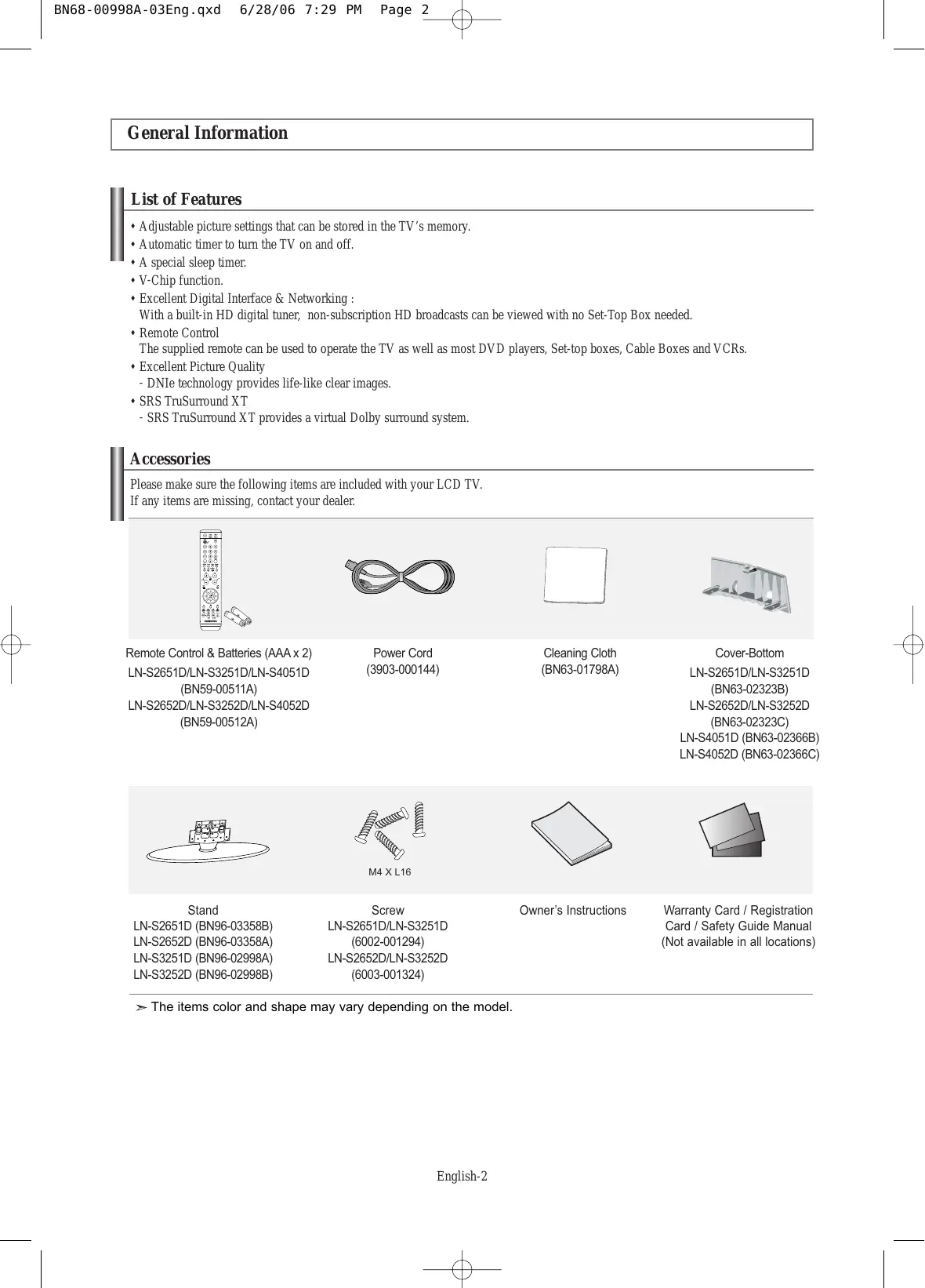 One-Touch Button English-1 List of Features Adjustable picture settings that can be stored in the TV’s memory. Automatic timer to turn the TV on and off. A special sleep timer. V-Chip function. Excellent Digital Interface & Networking : With a built-in HD digital tuner, non-subscription HD broadcasts can be viewed with no Set-Top Box needed. Remote Control The supplied remote can be used to operate the TV as well as most DVD players, Set-top boxes, Cable Boxes and VCRs. Excellent Picture Quality - DNIe technology provides life-like clear images. SRS TruSurround XT - SRS TruSurround XT provides a virtual Dolby surround system. Accessories Please make sure the following items are included with your LCD TV. If any items are missing, contact your dealer. Remote Control & Batteries (AAA x 2) LN-S2651D/LN-S3251D/LN-S4051D (BN59-00511A) LN-S2652D/LN-S3252D/LN-S4052D (BN59-00512A) Power Cord (3903-000144) Cleaning Cloth (BN63-01798A) Cover-Bottom LN-S2651D/LN-S3251D (BN63-02323B) LN-S2652D/LN-S3252D (BN63-02323C) LN-S4051D (BN63-02366B) LN-S4052D (BN63-02366C) M4 X L16 Stand LN-S2651D (BN96-03358B) LN-S2652D (BN96-03358A) LN-S3251D (BN96-02998A) LN-S3252D (BN96-02998B) Screw LN-S2651D/LN-S3251D (6002-001294) LN-S2652D/LN-S3252D (6003-001324) The items color and shape may vary depending on the model. English-2 Owner’s Instructions Warranty Card / Registration Card / Safety Guide Manual (Not available in all locations) BN68-00998A-03Eng.qxd 6/28/06 7:29 PM Page 3 Viewing the Control Panel Buttons on the Lower-Right Part of the Panel The buttons on the lower-right panel control your TV’s basic features, including the on-screen menu. To use the more advanced features, you must use the remote control. The product color and shape may vary depending on the model. SOURCE Toggles between all the available input sources (TV, AV1, AV2, S-Video1, S-Video2, Component, PC, HDMI1, HDMI2). In the on-screen menu, use this button as you would use the ENTER button on the remote control. 26 inch model supports TV, AV, S-Video, Component, PC, HDMI1, and HDMI2 only. Press to change channels. In the on-screen menu, use the buttons as you would use the and buttons on the remote control. SPEAKERS (POWER) Press to turn the TV on and off. MENU Press to see an on-screen menu of your TV’s features. POWER INDICATOR Blinks and turns off when the power is on and lights up in stand-by mode. Press to decrease or increase the volume. In the on-screen menu, use the buttons as you would use the and buttons on the remote control.