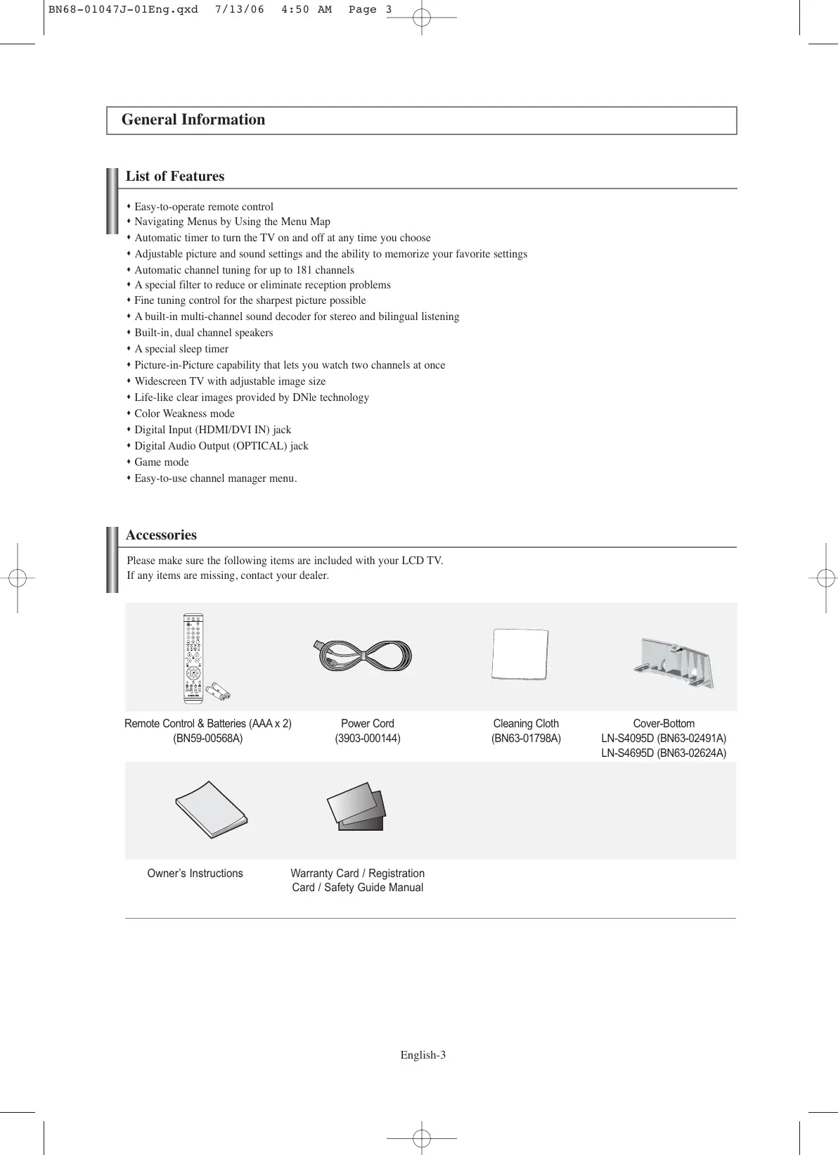 Note English-2 List of Features Easy-to-operate remote control Navigating Menus by Using the Menu Map Automatic timer to turn the TV on and off at any time you choose Adjustable picture and sound settings and the ability to memorize your favorite settings Automatic channel tuning for up to 181 channels A special filter to reduce or eliminate reception problems Fine tuning control for the sharpest picture possible A built-in multi-channel sound decoder for stereo and bilingual listening Built-in, dual channel speakers A special sleep timer Picture-in-Picture capability that lets you watch two channels at once Widescreen TV with adjustable image size Life-like clear images provided by DNle technology Color Weakness mode Digital Input (HDMI/DVI IN) jack Digital Audio Output (OPTICAL) jack Game mode Easy-to-use channel manager menu. Accessories Please make sure the following items are included with your LCD TV. If any items are missing, contact your dealer. Remote Control & Batteries (AAA x 2) (BN59-00568A) Owner’s Instructions Power Cord (3903-000144) Warranty Card / Registration Card / Safety Guide Manual English-3 Cleaning Cloth (BN63-01798A) Cover-Bottom LN-S4095D (BN63-02491A) LN-S4695D (BN63-02624A) BN68-01047J-01Eng.qxd 7/13/06 4:50 AM Page 4 Viewing the Control Panel Buttons on the Lower-Right Part of the Panel The buttons on the lower-right panel control your TV’s basic features, including the on-screen menu. To use the more advanced features, you must use the remote control. The product color and shape may vary depending on the model. SOURCE Toggles between all the available input sources (TV, AV1, AV2, S-Video1, S-Video2, Component1, Component2, PC, HDMI1, HDMI2). In the on-screen menu, use this button as you would use the ENTER button on the remote control. MENU Press to see an on-screen menu of your TV’s features. Press to increase or decrease the volume. In the on-screen menu, use the buttons as you would use the and buttons on the remote control. English-4 Press to change channels. In the on-screen menu, use the buttons as you would use the and buttons on the remote control. SPEAKERS (POWER) Press to turn the TV on and off. POWER INDICATOR Blinks and turns off when the power is on and lights up in stand-by mode.
