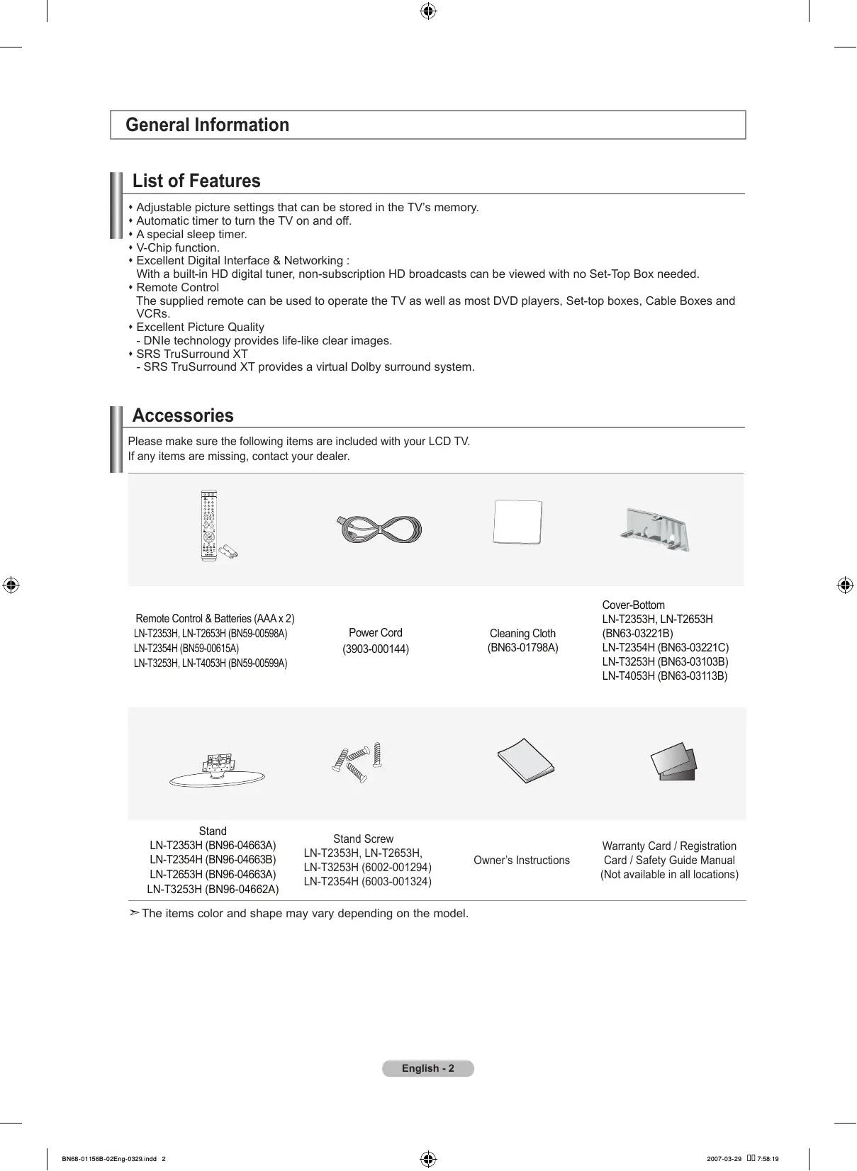 - Specifications Symbol Press Important Note One-Touch Button English - BN68-01156B-02Eng-0329.indd 1 2007-03-29 7:58:16 General Information List of Features Adjustable picture settings that can be stored in the TV’s memory. Automatic timer to turn the TV on and off. A special sleep timer. V-Chip function. Excellent Digital Interface & Networking : With a built-in HD digital tuner, non-subscription HD broadcasts can be viewed with no Set-Top Box needed. Remote Control The supplied remote can be used to operate the TV as well as most DVD players, Set-top boxes, Cable Boxes and VCRs. Excellent Picture Quality - DNIe technology provides life-like clear images. SRS TruSurround XT - SRS TruSurround XT provides a virtual Dolby surround system. Accessories Please make sure the following items are included with your LCD TV. If any items are missing, contact your dealer. Remote Control & Batteries (AAA x 2) LN-T2353H, LN-T2653H (BN59-00598A) LN-T2354H (BN59-00615A) LN-T3253H, LN-T4053H (BN59-00599A) Stand LN-T2353H (BN96-04663A) LN-T2354H (BN96-04663B) LN-T2653H (BN96-04663A) LN-T3253H (BN96-04662A) Power Cord (3903-000144) Stand Screw LN-T2353H, LN-T2653H, LN-T3253H (6002-001294) LN-T2354H (6003-001324) Cleaning Cloth (BN63-01798A) Owner’s Instructions Cover-Bottom LN-T2353H, LN-T2653H (BN63-03221B) LN-T2354H (BN63-03221C) LN-T3253H (BN63-03103B) LN-T4053H (BN63-03113B) Warranty Card / Registration Card / Safety Guide Manual (Not available in all locations) The items color and shape may vary depending on the model. English - BN68-01156B-02Eng-0329.indd 2 2007-03-29 7:58:19 Viewing the Control Panel Buttons on the Lower-Right Part of the Panel The buttons on the lower-right panel control your TV’s basic features, including the on-screen menu. To use the more advanced features, you must use the remote control. p. 89