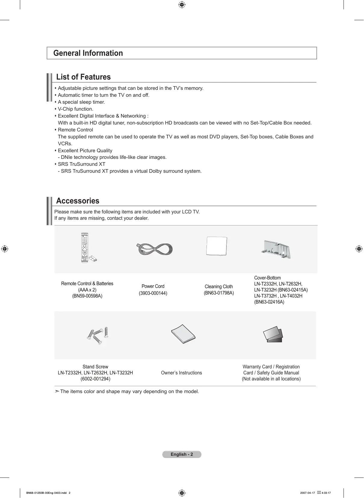 - Serial No. ____________ 2007-04-17 4:31:13 Important Warranty Information Regarding Television Format Viewing Wide screen format LCD Displays (16:9, the aspect ratio of the screen width to height) are primarily designed to view wide ,screen format full-motion video. The images displayed on them should primarily be in the wide screen 16:9 ratio format or expanded to fill the screen if your model offers this feature and the images are constantly moving. Displaying stationary graphics and images on screen, such as the dark side-bars on nonexpanded standard format television video and .programming, should be limited to no more than 5% of the total television viewing per week ,Additionally, viewing other stationary images and text such as stock market reports, video game displays, station logos web sites or computer graphics and patterns, should be limited as described above for all televisions. Displaying stationary images that exceed the above guidelines can cause uneven aging of LCD Displays that leave subtle, but permanent burned-in ghost images in the LCD picture. To avoid this, vary the programming and images, and primarily display .full screen moving images, not stationary patterns or dark bars .On LCD models that offer picture sizing features, use these controls to view different formats as a full screen picture Be careful in the selection and duration of television formats used for viewing. Uneven LCD aging as a result of format .selection and use, as well as burned-in images, are not covered by your Samsung limited warranty U.S.A Only The product unit accompanying this user manual is licensed under certain intellectual property rights of certain ,third parties. In particular, this product is licensed under the following US patents: 5,991,715, 5,740,317, 4,972,484 ,5,544,247 ,5,481,643 ,5,610,985 ,6,289,308 ,5,777,992 ,5,530,655 ,5,606,618 ,5,539,829 ,5,323,396 ,5,214,678 .and under US Published Patent Application No. 2001-44713-A1 ,5,878,080 ,6,023,490 ,5,960,037 This license is limited to private non-commercial use by end-user consumers for licensed contents. No rights are granted for commercial use. The license does not cover any product unit other than this product unit and the license does not extend to any unlicensed product unit or process conforming to ISO/IEC 11172-3 or ISO/IEC 13818-3 used or sold in combination with this product unit. The license only covers the use of this product unit to encode and/or decode audio files conforming to the ISO/IEC 11172-3 or ISO/IEC 13818-3. No rights are granted under this license for product .features or functions that do not conform to the ISO/IEC 11172-3 or ISO/IEC 13818-3 Other countries The product unit accompanying this user manual is licensed under certain intellectual property rights of certain third parties. This license is limited to private non-commercial use by end-user consumers for licensed contents. No rights are granted for commercial use. The license does not cover any product unit other than this product unit and the license does not extend to any unlicensed product unit or process conforming to ISO/IEC 11172-3 or ISO/IEC 13818-3 used or sold in combination with this product unit. The license only covers the use of this product unit to encode and/or decode audio files conforming to the ISO/IEC 11172-3 or ISO/IEC 13818-3. No rights are granted under this license for product .features or functions that do not conform to the ISO/IEC 11172-3 or ISO/IEC 13818-3 Precautions When Displaying a Still Image A still image may cause permanent damage to the TV screen