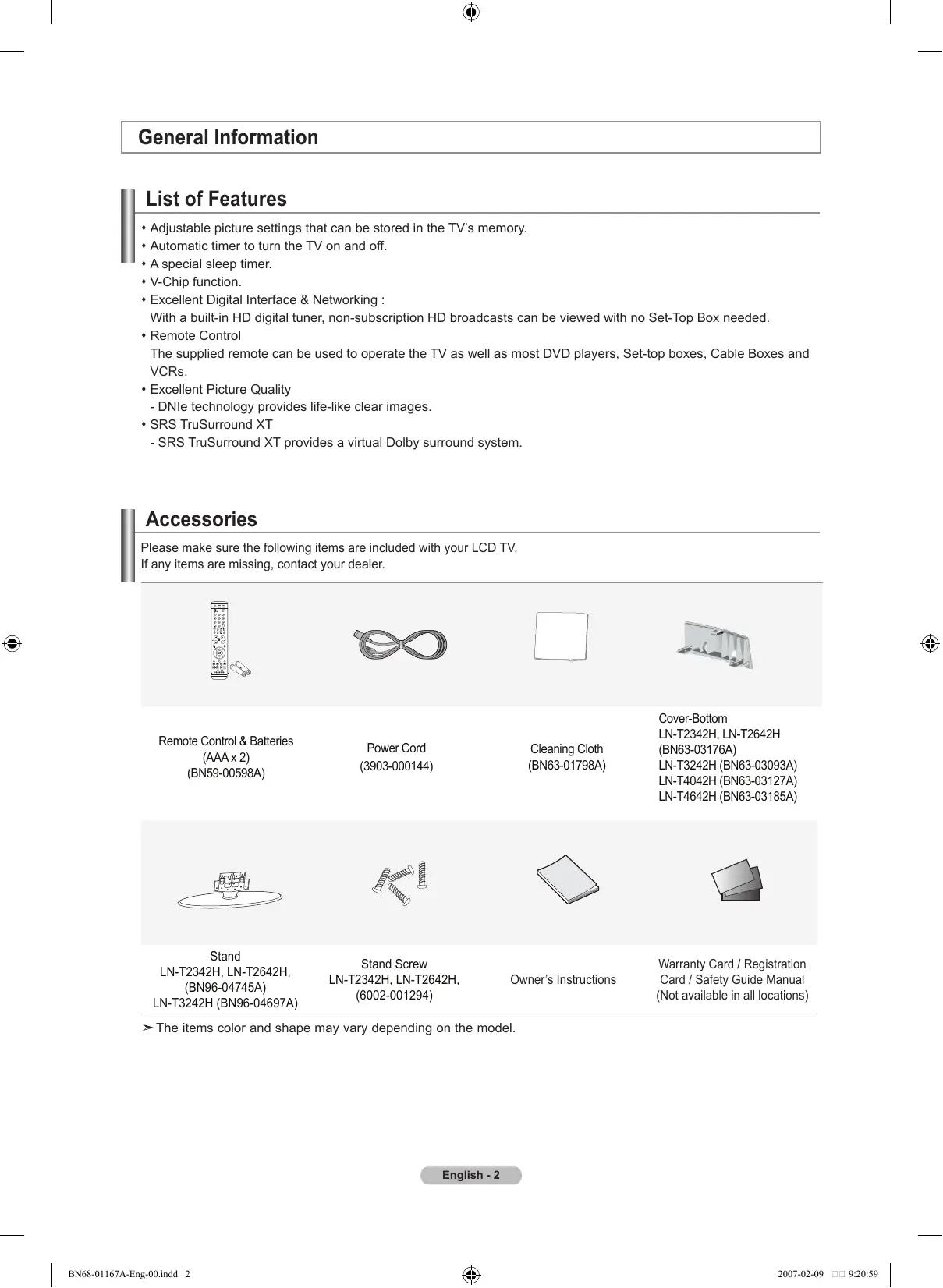 13 kg (28.6 lbs) 50 °F to 104 °F (10 °C to 40 °C) 10% to 80%, non-condensing -4 °F to 113 °F (-20 °C to 45 °C) 5% to 95%, non-condensing 50 °F to 104 °F (10 °C to 40 °C) 10% to 80%, non-condensing -4 °F to 113 °F (-20 °C to 45 °C) 5% to 95%, non-condensing 50 °F to 104 °F (10 °C to 40 °C) 10% to 80%, non-condensing -4 °F to 113 °F (-20 °C to 45 °C) 5% to 95%, non-condensing Model Name LN-T4042H LN-T4642H 40 inches 46 inches 195 W 255 W 1360 x 768 @ 60 Hz 1360 x 768 @ 60 Hz 10W X 2 10W X 2 1084 X 300 X 690 mm (42.6 X 11.8 X 27.1 inches) 1084 X 95 X 639 mm (42.6 X 3.7 X 25.1 inches) 1220 X 326 X 776 mm (48.0 X 12.8 X 30.5 inches) 1220 X 111 X 709 mm (48.0 X 4.3 X 27.9 inches)