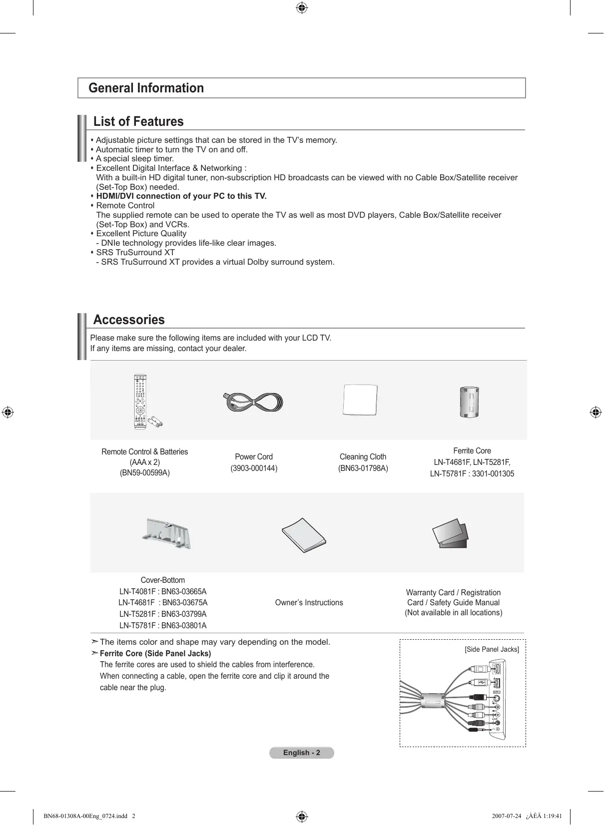 One-Touch Button English - BN68-01308A-00Eng_0723.indd 1 2007-07-23 ¿ÀÈÄ 2:12:23 General Information List of Features Adjustable picture settings that can be stored in the TV’s memory. Automatic timer to turn the TV on and off. A special sleep timer. Excellent Digital Interface & Networking : With a built-in HD digital tuner, non-subscription HD broadcasts can be viewed with no Cable Box/Satellite receiver (Set-Top Box) needed. HDMI/DVI connection of your PC to this TV. Remote Control The supplied remote can be used to operate the TV as well as most DVD players, Cable Box/Satellite receiver (Set-Top Box) and VCRs. Excellent Picture Quality - DNIe technology provides life-like clear images. SRS TruSurround XT - SRS TruSurround XT provides a virtual Dolby surround system. Accessories Please make sure the following items are included with your LCD TV. If any items are missing, contact your dealer. Remote Control & Batteries (AAA x 2) (BN59-00599A) Cleaning Cloth (BN63-01798A) Owner’s Instructions The items color and shape may vary depending on the model. Ferrite Core (Side Panel Jacks) The ferrite cores are used to shield the cables from interference. When connecting a cable, open the ferrite core and clip it around the cable near the plug. Warranty Card / Registration Card / Safety Guide Manual (Not available in all locations) [Side Panel Jacks] English - BN68-01308A-00Eng_0724.indd 2 2007-07-24 ¿ÀÈÄ 1:19:41 Viewing the Control Panel Buttons on the Lower-Right Part of the Panel The buttons on the lower-right panel control your TV’s basic features, including the on-screen menu. To use the more advanced features, you must use the remote control.