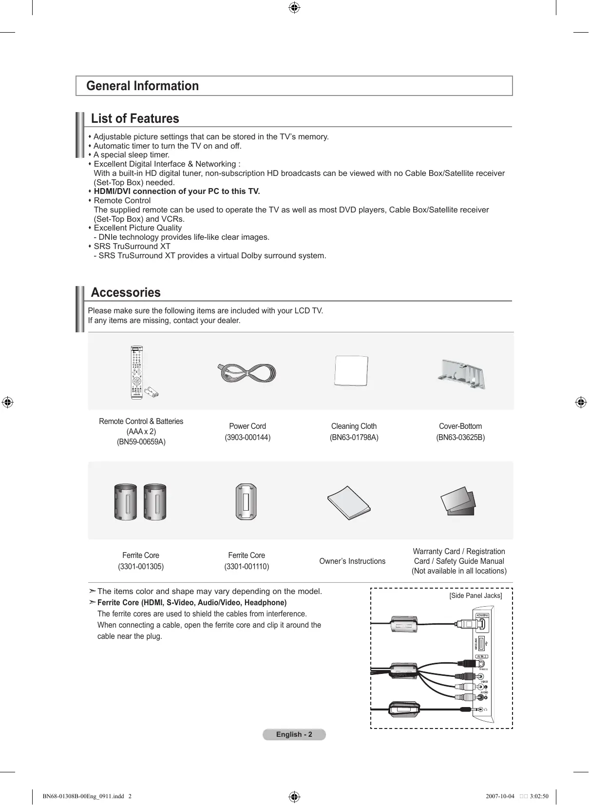 One-Touch Button English - BN68-01308B-00Eng_0911.indd 1 2007-10-04 3:02:48 General Information List of Features Adjustable picture settings that can be stored in the TV’s memory. Automatic timer to turn the TV on and off. A special sleep timer. Excellent Digital Interface & Networking : With a built-in HD digital tuner, non-subscription HD broadcasts can be viewed with no Cable Box/Satellite receiver (Set-Top Box) needed. HDMI/DVI connection of your PC to this TV. Remote Control The supplied remote can be used to operate the TV as well as most DVD players, Cable Box/Satellite receiver (Set-Top Box) and VCRs. Excellent Picture Quality - DNIe technology provides life-like clear images. SRS TruSurround XT - SRS TruSurround XT provides a virtual Dolby surround system. Accessories Please make sure the following items are included with your LCD TV. If any items are missing, contact your dealer. Remote Control & Batteries (AAA x 2) (BN59-00659A) Power Cord (3903-000144) Cleaning Cloth (BN63-01798A) Cover-Bottom (BN63-03625B) Ferrite Core (3301-001305) Ferrite Core (3301-001110) Owner’s Instructions Warranty Card / Registration Card / Safety Guide Manual (Not available in all locations) The items color and shape may vary depending on the model. Ferrite Core (HDMI, S-Video, Audio/Video, Headphone) The ferrite cores are used to shield the cables from interference. When connecting a cable, open the ferrite core and clip it around the cable near the plug. [Side Panel Jacks] English - BN68-01308B-00Eng_0911.indd 2 2007-10-04 3:02:50 Viewing the Control Panel Buttons on the Lower-Right Part of the Panel The buttons on the lower-right panel control your TV’s basic features, including the on-screen menu. To use the more advanced features, you must use the remote control.