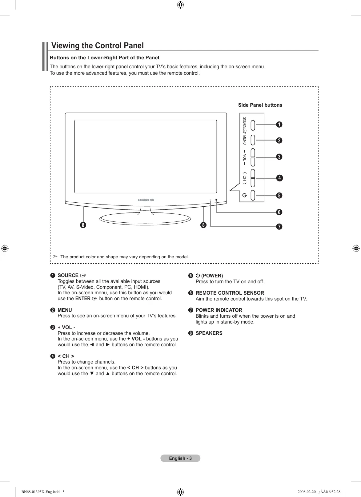 Connects to the HDMI jack of a device with an HDMI output. Use the HDMI/DVI IN jack for DVI connection to an external device. Use a DVI to HDMI cable or DVI-HDMI adapter (DVI to HDMI) for video connection and the DVI IN [R-AUDIO-L] jacks for audio. - No sound connection is needed for an HDMI to HDMI connection. - When using an HDMI/DVI cable connection, you must use the HDMI/DVI IN jack. 5 SERVICE, EX-LINK Connector for SERVICE only. 7 KENSINGTON LOCK The Kensington Lock (optional) is a device used to physically fix the system when used in a public place. If you want to use a locking device, contact the dealer where you purchased the TV. The location of the Kensington Lock may be different depending on its model. (HEADPHONE) Connects a set of external headphones for private listening. 9 AV IN Video and audio inputs for external devices, such as a camcorder or VCR. S-VIDEO Connects an S-Video signal from a camcorder or VCR. 0 COMPONENT IN The COMPONENT IN jack is also used as the AV IN jack. ! POWER INPUT Connects the supplied power cord. 6 ANT IN Connects to an antenna or cable TV system. English - BN68-01395D-Eng.indd 4 2008-02-20 ¿ÀÀü 6:52:29 Remote Control You can use the remote control up to a distance of about 23 feet from the TV. 1 POWER Turns the TV on and off. 2 TV Selects the TV mode directly. 3 NUMERIC BUTTONS Press to change the channel. Press to select additional channels(digital and analog) being broadcast by the same station. For example, to select channel “54-3”, press “54”, then press “ ” and “3”. 5 (MUTE) Press to temporarily cut off the sound. @ MTS Press to choose stereo, mono or Separate Audio Program (SAP broadcast). # SOURCE Press to display and select the available video sources. $ PRE CH Tunes to the previous channel. % CH / CH Press to change channels. ^ RETURN Returns to the previous menu. & EXIT Press to exit the menu. 6 VOL / VOL Press to increase or decrease the volume.