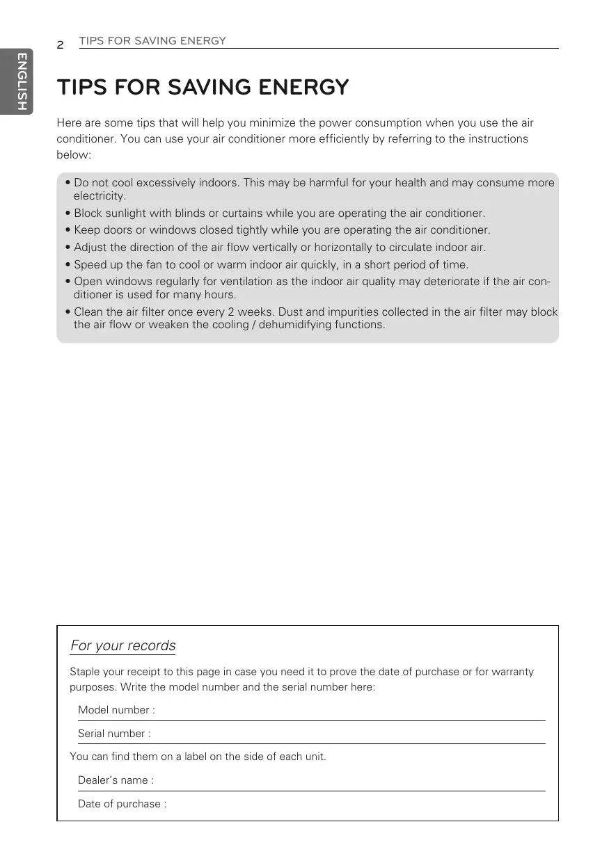 • Do not cool excessively indoors. This may be harmful for your health and may consume more electricity. • Block sunlight with blinds or curtains while you are operating the air conditioner. • Keep doors or windows closed tightly while you are operating the air conditioner. • Adjust the direction of the air flow vertically or horizontally to circulate indoor air. • Speed up the fan to cool or warm indoor air quickly, in a short period of time. • Open windows regularly for ventilation as the indoor air quality may deteriorate if the air conditioner is used for many hours. • Clean the air filter once every 2 weeks. Dust and impurities collected in the air filter may block the air flow or weaken the cooling / dehumidifying functions.