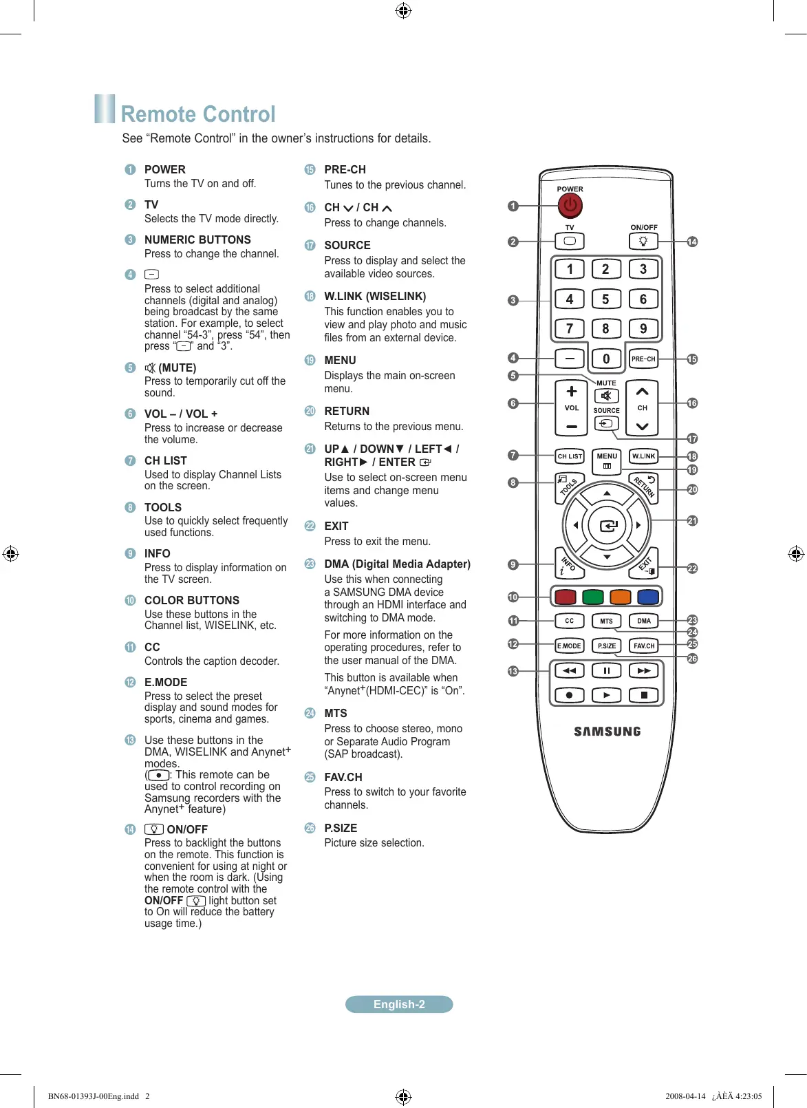 PC/COMPONENT Better AUDIO (Analog) Normal S-VIDEO Good VIDEO Normal English- BN68-01393J-00Eng.indd 1 2008-04-14 ¿ÀÈÄ 4:23:04 Remote Control See “Remote Control” in the owner’s instructions for details. 1 POWER Turns the TV on and off. % PRE-CH Tunes to the previous channel. 2 TV Selects the TV mode directly. ^ CH / CH Press to change channels. 3 NUMERIC BUTTONS Press to change the channel. & SOURCE Press to display and select the available video sources.