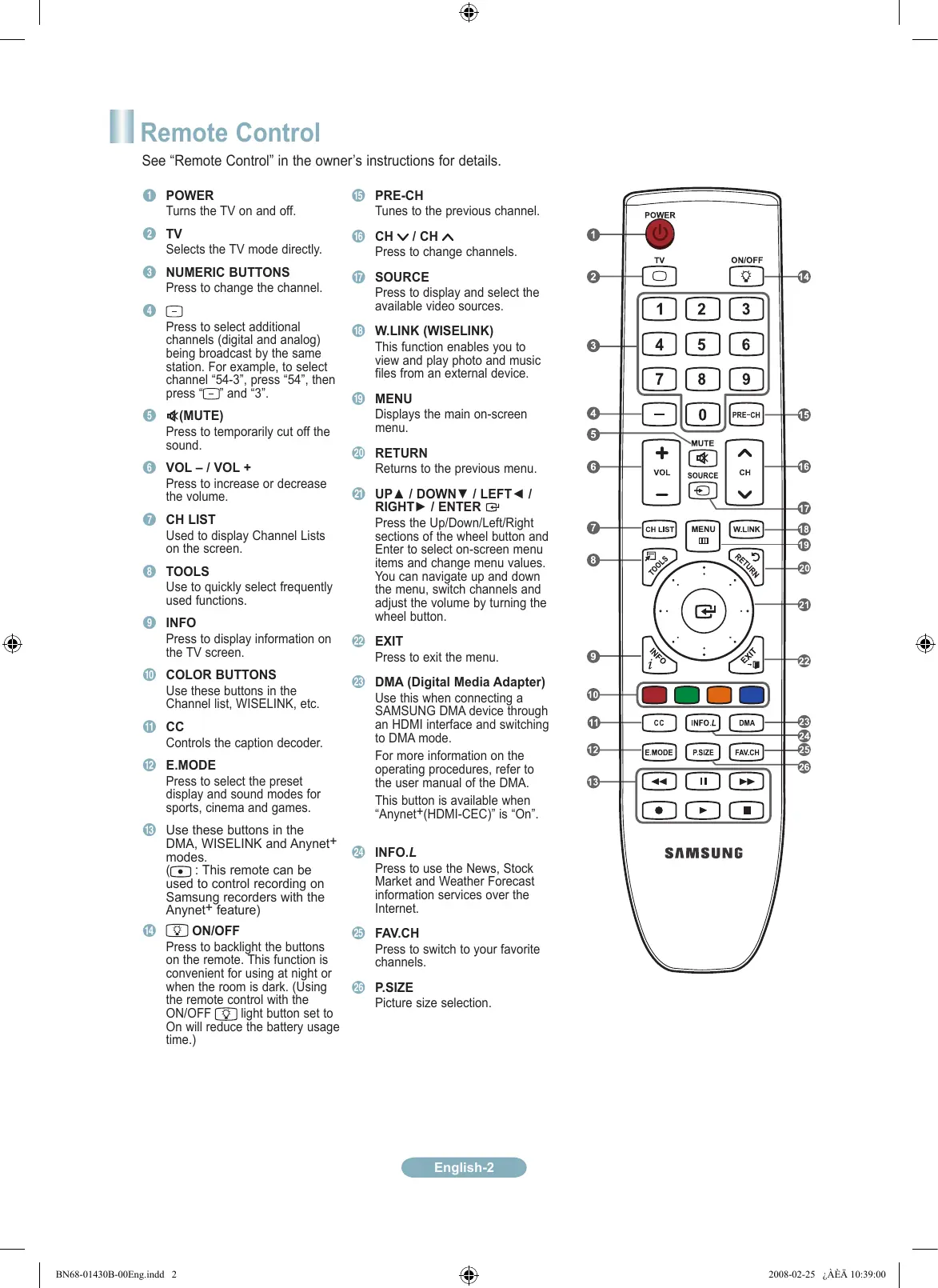 (MUTE) Press to temporarily cut off the sound. 6 VOL – / VOL + Press to increase or decrease the volume. 7 CH LIST Used to display Channel Lists on the screen. 8 TOOLS Use to quickly select frequently used functions. 9 INFO Press to display information on the TV screen. 0 COLOR BUTTONS Use these buttons in the Channel list, WISELINK, etc. ! CC Controls the caption decoder. @ E.MODE Press to select the preset display and sound modes for sports, cinema and games. # Use these buttons in the DMA, WISELINK and Anynet+ modes. : This remote can be used to control recording on Samsung recorders with the Anynet+ feature)