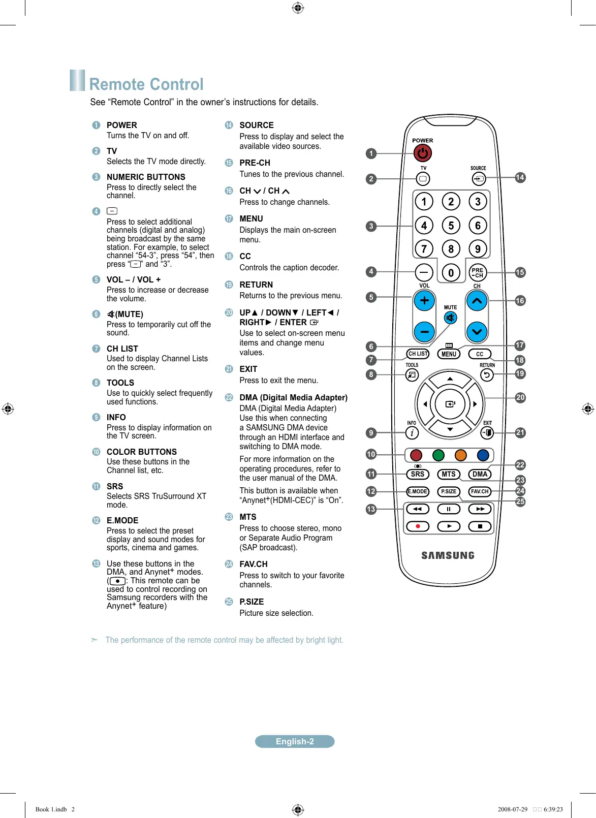 e P.SIZE Picture size selection. ➣ The performance of the remote control may be affected by bright light. English- Book 1.indb 2 2008-07-29 6:39:23 Connecting a DVD Player or Cable Box/Satellite receiver (Set-Top Box) via HDMI