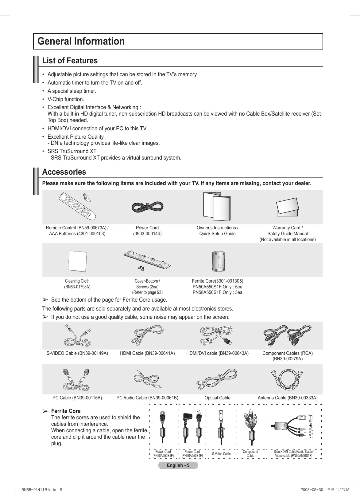 Warranty Card / Safety Guide Manual (Not available in all locations) See the bottom of the page for Ferrite Core usage. The following parts are sold separately and are available at most electronics stores. ➢ If you do not use a good quality cable, some noise may appear on the screen. S-VIDEO Cable (BN39-00149A) HDMI Cable (BN39-00641A) HDMI/DVI cable (BN39-00643A) Component Cables (RCA) (BN39-00279A) PC Cable (BN39-00115A) PC Audio Cable (BN39-00061B) Optical Cable Antenna Cable (BN39-00333A)