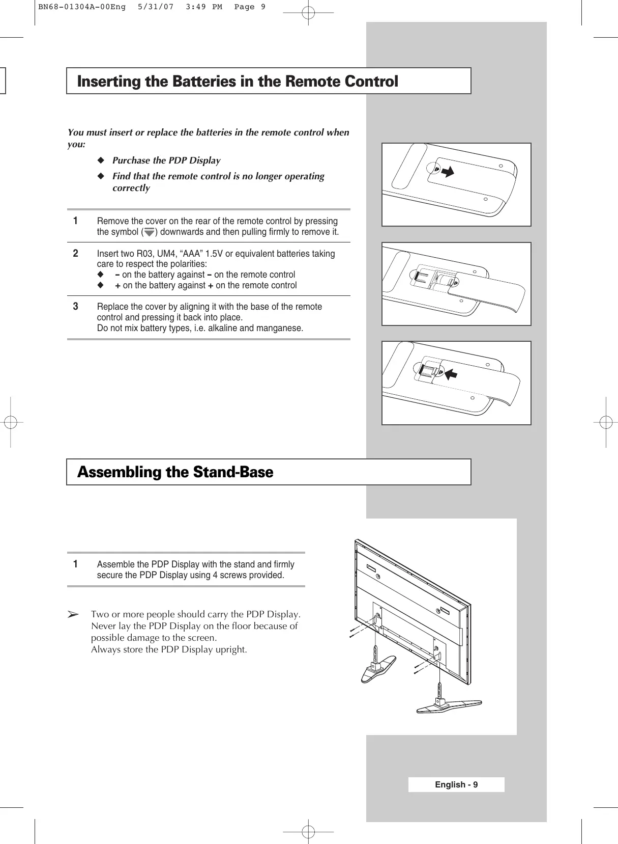 (PIP) - SOURCE SELECTION (SOURCE) The performance of the remote control may be affected by bright light. BN68-01304A-00Eng 5/31/07 3:49 PM Page 9 Inserting the Batteries in the Remote Control You must insert or replace the batteries in the remote control when you: ◆ Purchase the PDP Display ◆ Find that the remote control is no longer operating correctly