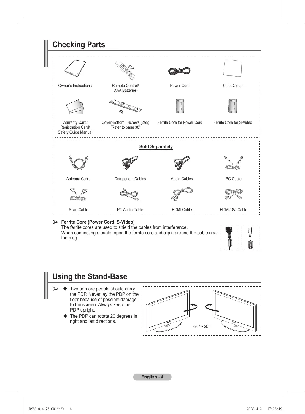 2008-4-2 17:38:47 Checking Parts Owner’s Instructions Remote Control/ AAA Batteries Power Cord Cloth-Clean Warranty Card/ Registration Card/ Safety Guide Manual Cover-Bottom / Screws (2ea) (Refer to page 38) Ferrite Core for Power Cord Ferrite Core for S-Video Sold Separately Antenna Cable Component Cables Audio Cables PC Cable Scart Cable PC Audio Cable HDMI Cable HDMI/DVI Cable Core (Power Cord, S-Video) ➢ Ferrite The ferrite cores are used to shield the cables from interference. When connecting a cable, open the ferrite core and clip it around the cable near the plug. Using the Stand-Base
