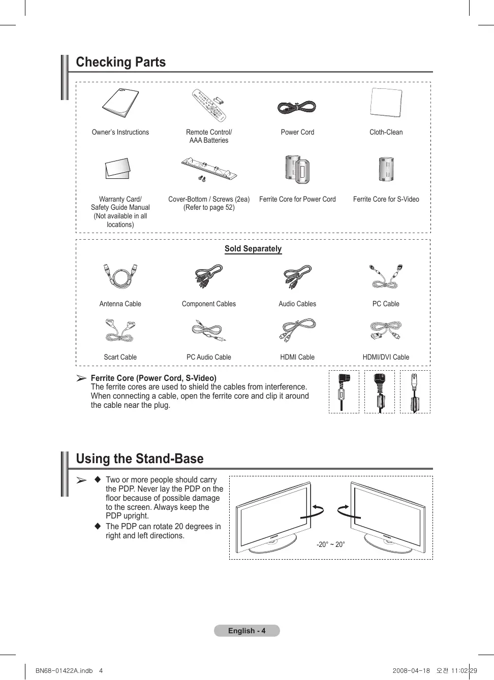 Important Note Symbols Press English Contents English - BN68-01422A.indb 3 2008-04-18 오전 11:02:26 Checking Parts Owner’s Instructions Remote Control/ AAA Batteries Power Cord Cloth-Clean Warranty Card/ Safety Guide Manual (Not available in all locations) Cover-Bottom / Screws (2ea) (Refer to page 52) Ferrite Core for Power Cord Ferrite Core for S-Video Sold Separately Antenna Cable Component Cables Audio Cables PC Cable Scart Cable PC Audio Cable HDMI Cable HDMI/DVI Cable Core (Power Cord, S-Video) ➢ Ferrite The ferrite cores are used to shield the cables from interference. When connecting a cable, open the ferrite core and clip it around the cable near the plug. Using the Stand-Base